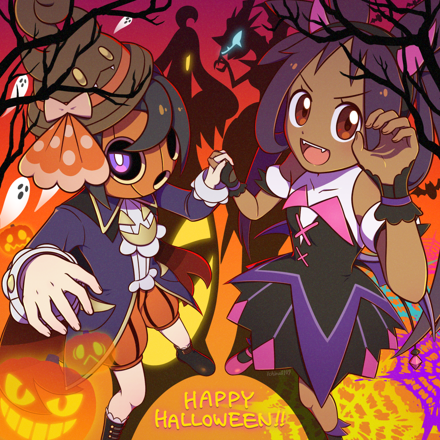 1boy 1girl allister_(fall_2022)_(pokemon) allister_(pokemon) bare_tree brown_headwear character_hat commentary_request dark-skinned_female dark_skin dress fake_horns fangs gen_6_pokemon gen_7_pokemon ghost gourgeist happy_halloween highres holding_hands horns ichina0107 iris_(fall_2022)_(pokemon) iris_(pokemon) jack-o'-lantern mask naganadel nintendo official_alternate_costume open_mouth pokemon pokemon_(creature) pokemon_masters_ex purple_eyes purple_hair red_eyes sleeveless sleeveless_dress tree ultra_beast v-shaped_eyebrows