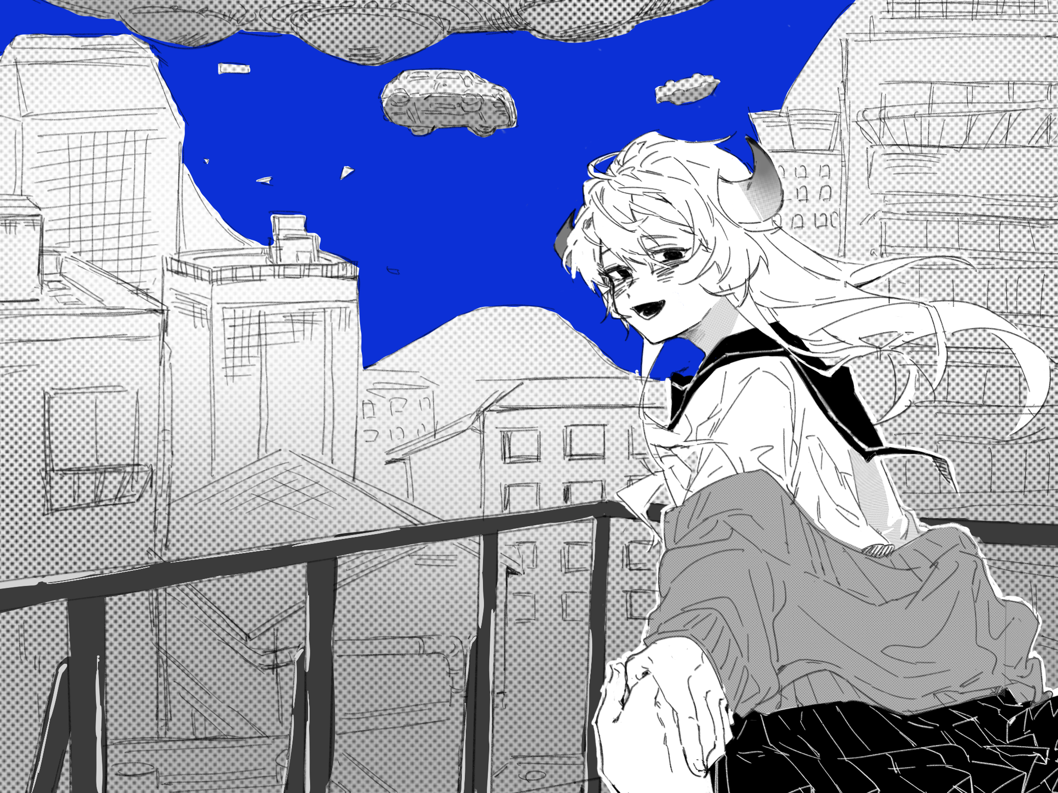 1girl blue_background blue_sky blush car cardigan_partially_removed cevio chinese_commentary city cityscape commentary_request empty_eyes floating floating_hair floating_object greyscale_with_colored_background halftone halftone_background highres holding_hands horns isei_ni_ikou_ne_(cevio) long_hair long_sleeves looking_at_viewer looking_back motor_vehicle open_mouth outdoors outline pleated_skirt pov pov_hands railing school_uniform serafuku sketch_background skirt sky smile solo_focus ufo unfinished white_outline wo_xiang_shuijiao