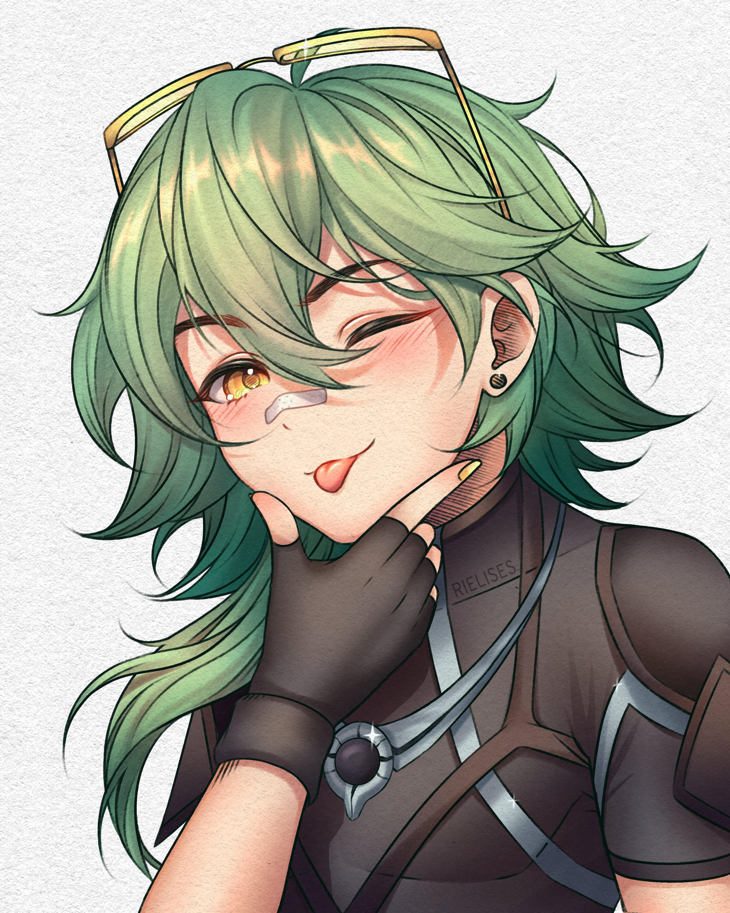 1boy absurdres blush covered_collarbone eyewear_on_head ezreal fingerless_gloves gloves green_hair grey_background hair_between_eyes hand_on_own_chin hand_up heartsteel_ezreal highres index_finger_raised league_of_legends long_hair nail_polish rielises short_sleeves smile solo sunglasses tongue tongue_out upper_body yellow_eyes yellow_nails