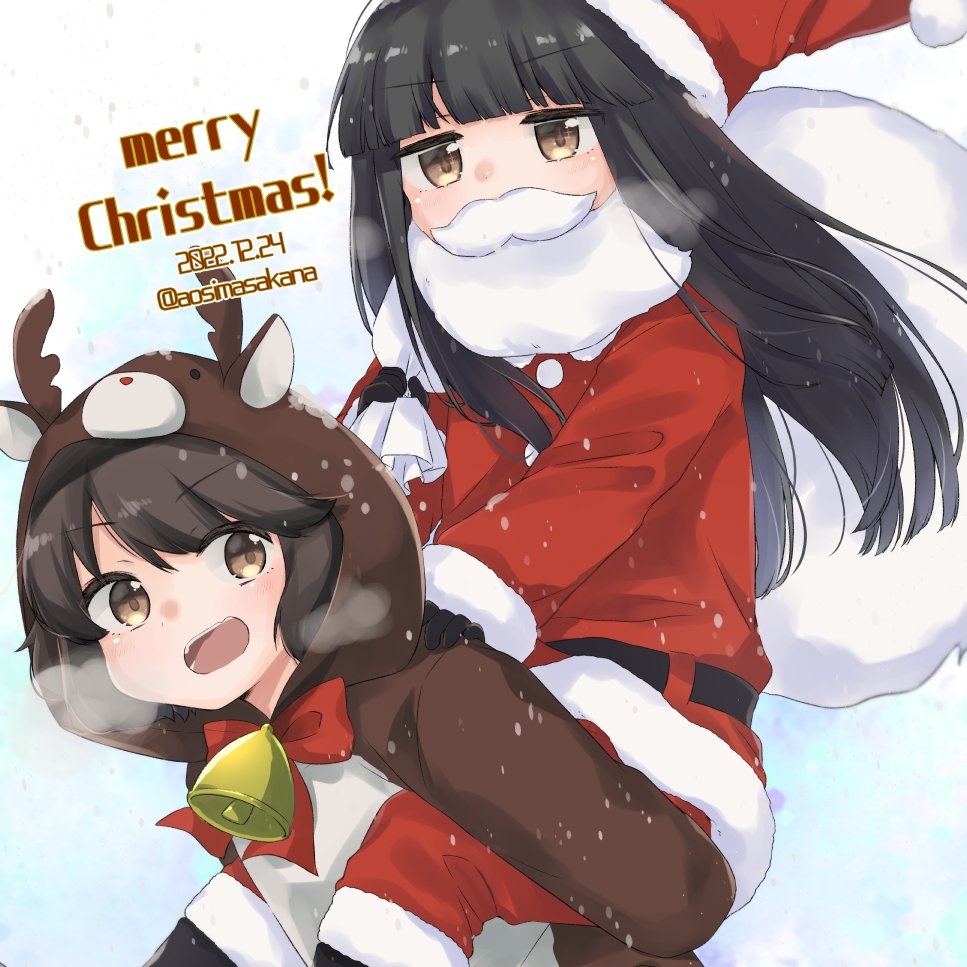 2girls animal_costume animal_hood aoshima_sakana bell black_gloves blunt_bangs bow breath brown_eyes brown_hair carrying christmas dated fake_facial_hair fake_mustache gloves hat hatsuyuki_(kancolle) holding holding_sack hood kantai_collection long_hair merry_christmas miyuki_(kancolle) multiple_girls open_mouth pants piggyback red_bow sack santa_costume santa_hat short_hair twitter_username