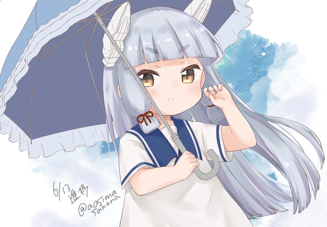 1girl :< aged_down aoshima_sakana blunt_bangs blush brown_eyes closed_mouth dated dress grey_hair hair_ribbon headgear holding holding_umbrella kantai_collection long_hair looking_at_viewer murakumo_(kancolle) parasol ribbon sailor_collar sailor_dress short_sleeves simple_background solo tress_ribbon twitter_username umbrella upper_body very_long_hair