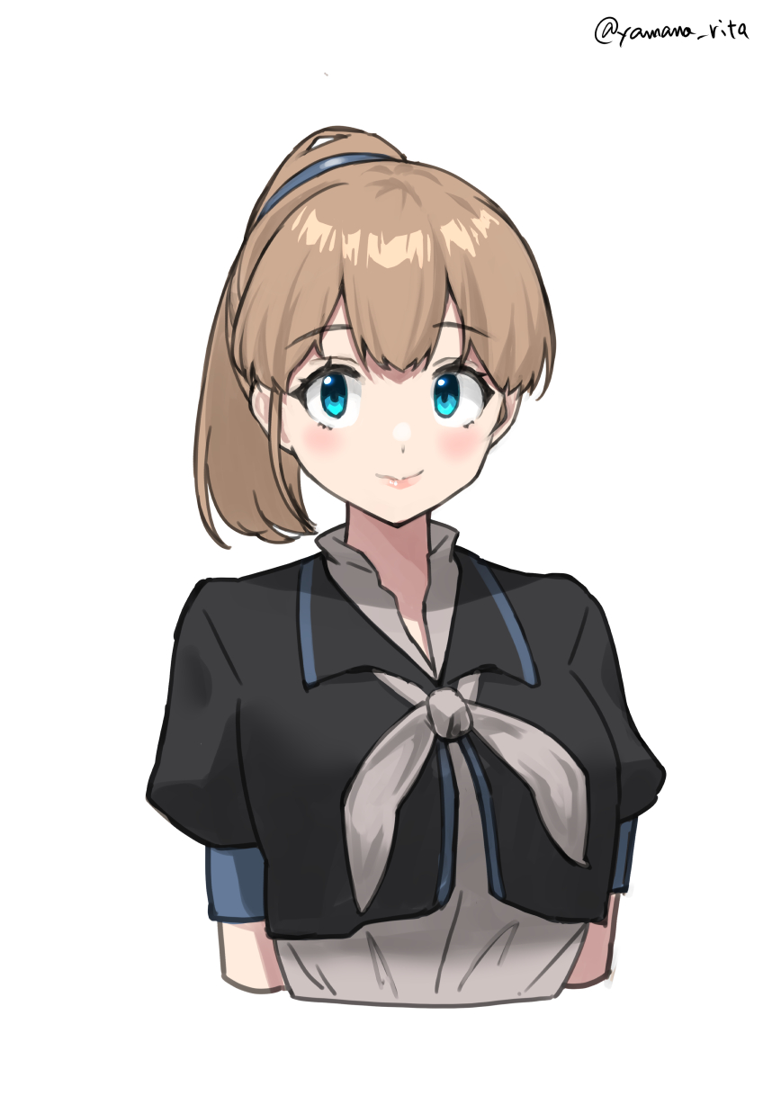 1girl blue_eyes blush breasts brown_hair closed_mouth cropped_torso hair_between_eyes highres intrepid_(kancolle) kantai_collection one-hour_drawing_challenge ponytail puffy_short_sleeves puffy_sleeves shirt short_sleeves simple_background solo twitter_username upper_body white_background yamano_rita