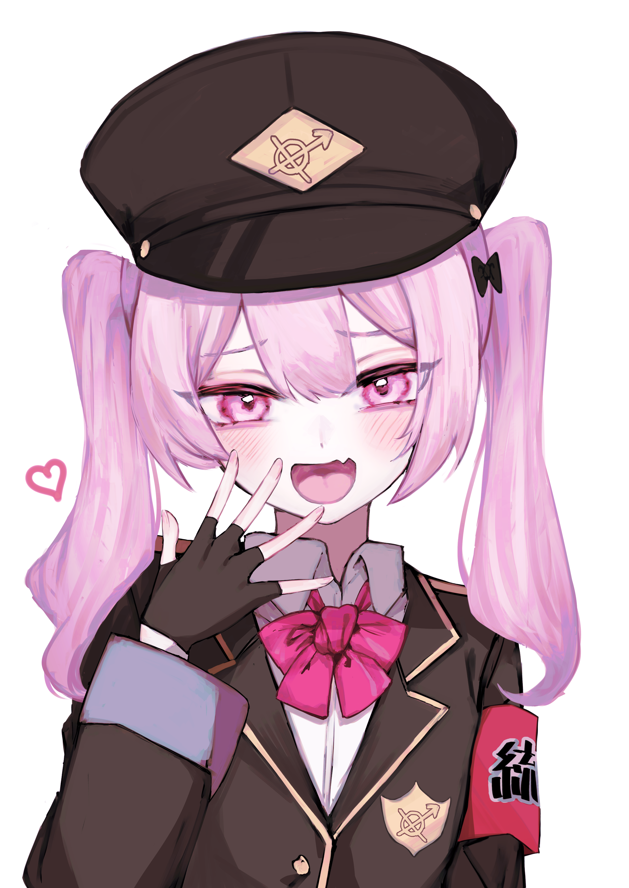 1girl absurdres armband black_bow black_coat black_hat blush bow bowtie coat collared_shirt commentary_request fang hair_between_eyes hair_bow hair_ornament hand_up hat heart highres lapels long_sleeves looking_at_viewer military_hat open_mouth original peaked_cap pink_bow pink_bowtie pink_eyes pink_hair red_armband shirt simple_background skin_fang smug solo twintails upper_body white_background white_shirt yagiusagi