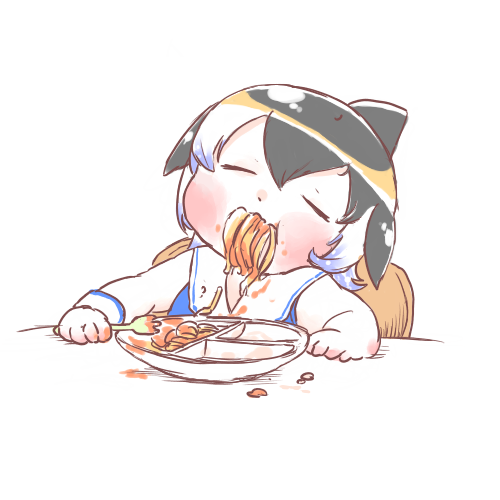 aged_down animal_ears black_hair blonde_hair blowhole blue_hair blush closed_eyes commentary common_dolphin_(kemono_friends) dolphin_girl dorsal_fin dress fins food food_in_mouth grey_hair head_fins kemono_friends leaning_to_the_side lowres maki_(02uh14l1b740ao2) messy multicolored_hair pasta sailor_collar shirt short_hair sitting sleeping sleeping_upright sleeveless white_hair