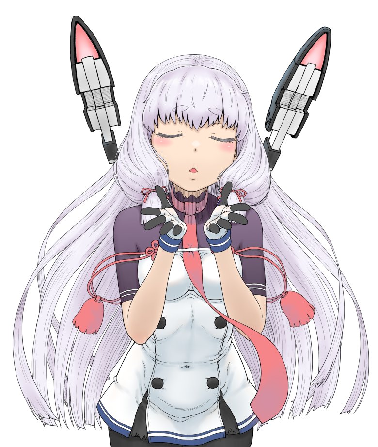 1girl blowing_kiss blush breasts closed_eyes kantai_collection long_hair medium_breasts minazuki_tsuyuha murakumo_(kancolle) murakumo_kai_ni_(kancolle) necktie pantyhose short_eyebrows sidelocks simple_background solo umamusume umapyoi_densetsu very_long_hair white_background