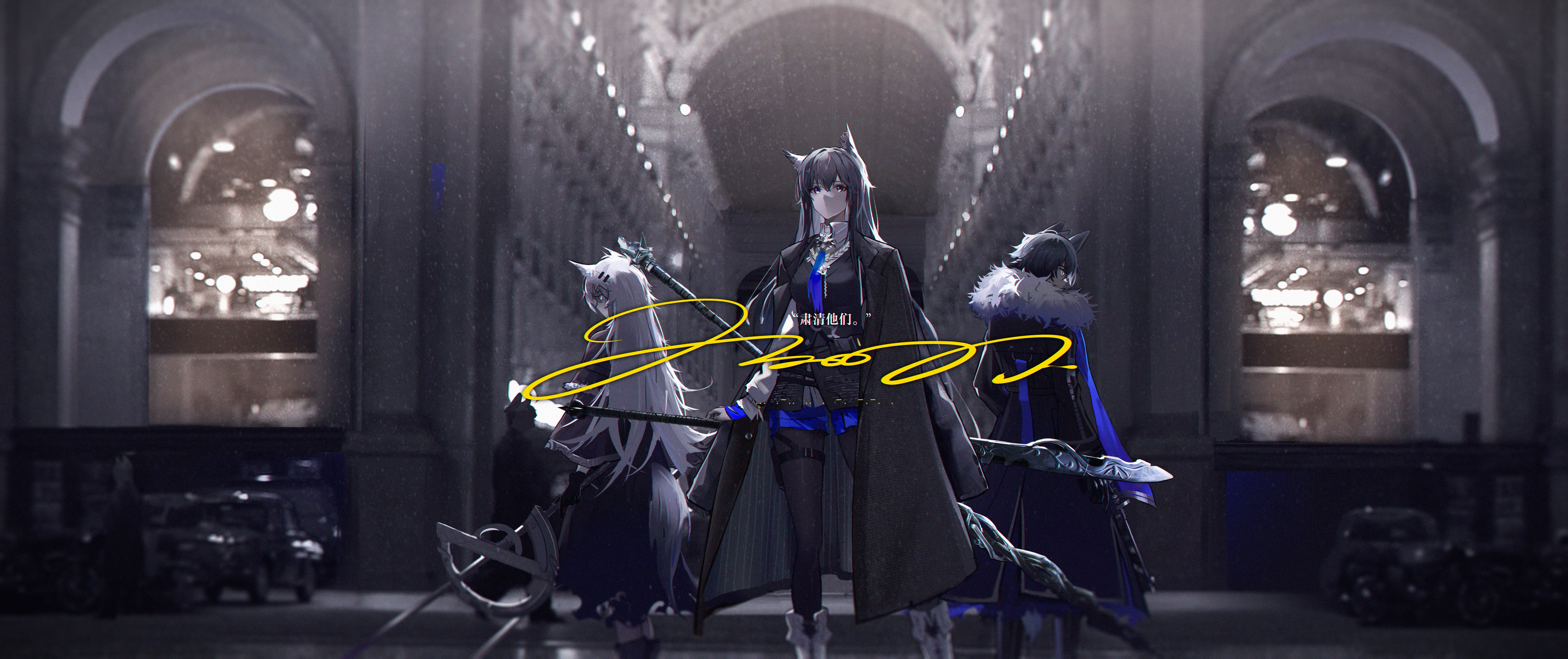 1boy 2girls absurdres animal_ear_fluff animal_ears arknights black_coat black_hair black_vest blue_gloves blue_necktie blue_shorts blurry blurry_background coat coat_on_shoulders fingerless_gloves fur-trimmed_coat fur_trim geralt7 gloves highres holding holding_sword holding_weapon lappland_(arknights) lappland_(refined_horrormare)_(arknights) long_hair multiple_girls necktie official_alternate_costume pantyhose pantyhose_under_shorts penguin_logistics_(arknights) shorts signature standing sword texas_(arknights) texas_the_omertosa_(arknights) vest vigil_(arknights) weapon white_hair wolf_boy wolf_ears wolf_girl
