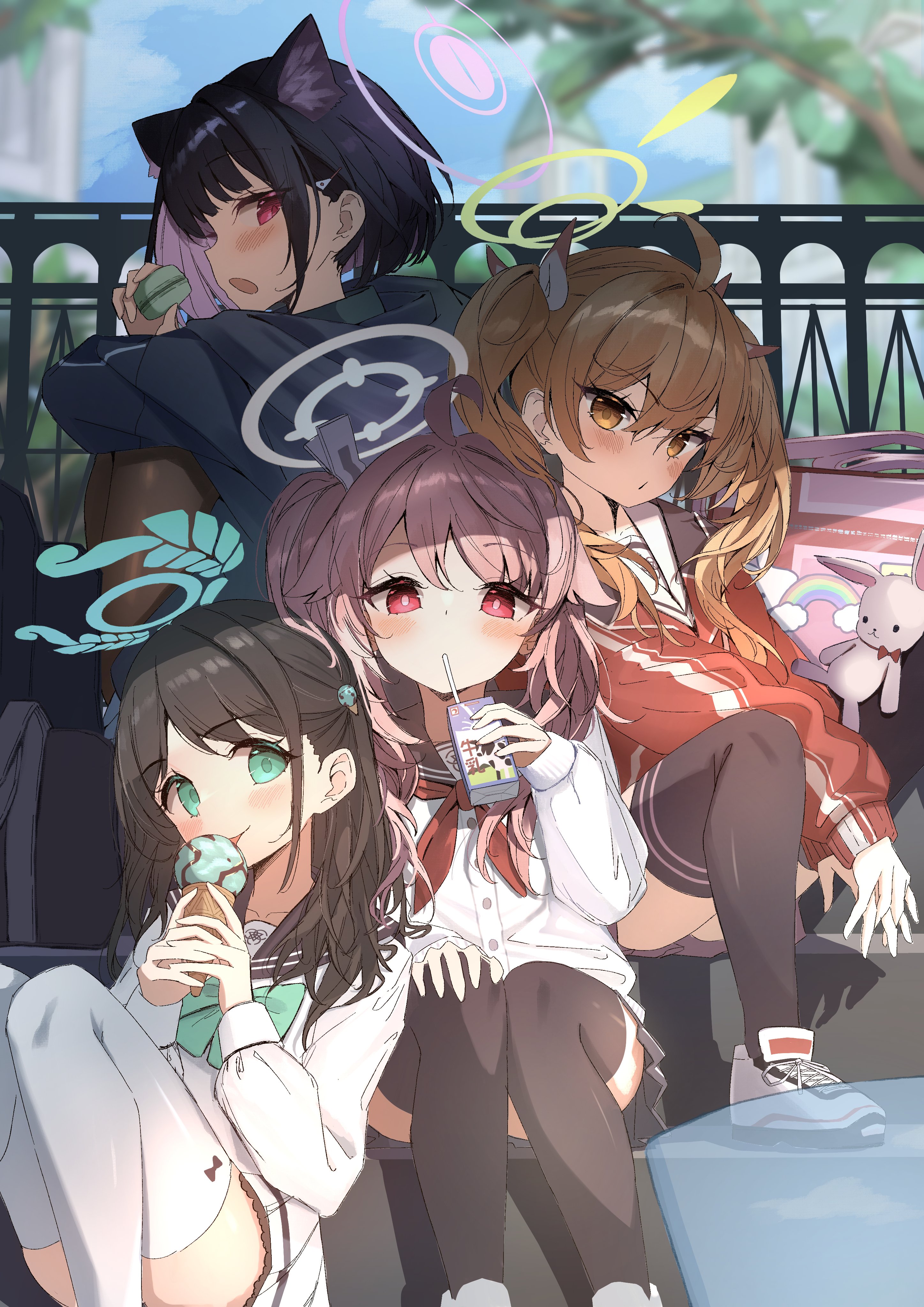 4girls absurdres after-school_sweets_club_(blue_archive) ahoge airi_(blue_archive) animal_ears black_hair blue_archive blush cat_ears commentary_request drink_carton drinking fence food green_eyes hair_between_eyes hair_ornament halo highres hiyayakko_(jfky2528) ice_cream kazusa_(blue_archive) long_hair milk_carton multiple_girls natsu_(blue_archive) pink_hair red_eyes school_uniform side_ponytail stuffed_animal stuffed_toy thighhighs yoshimi_(blue_archive)