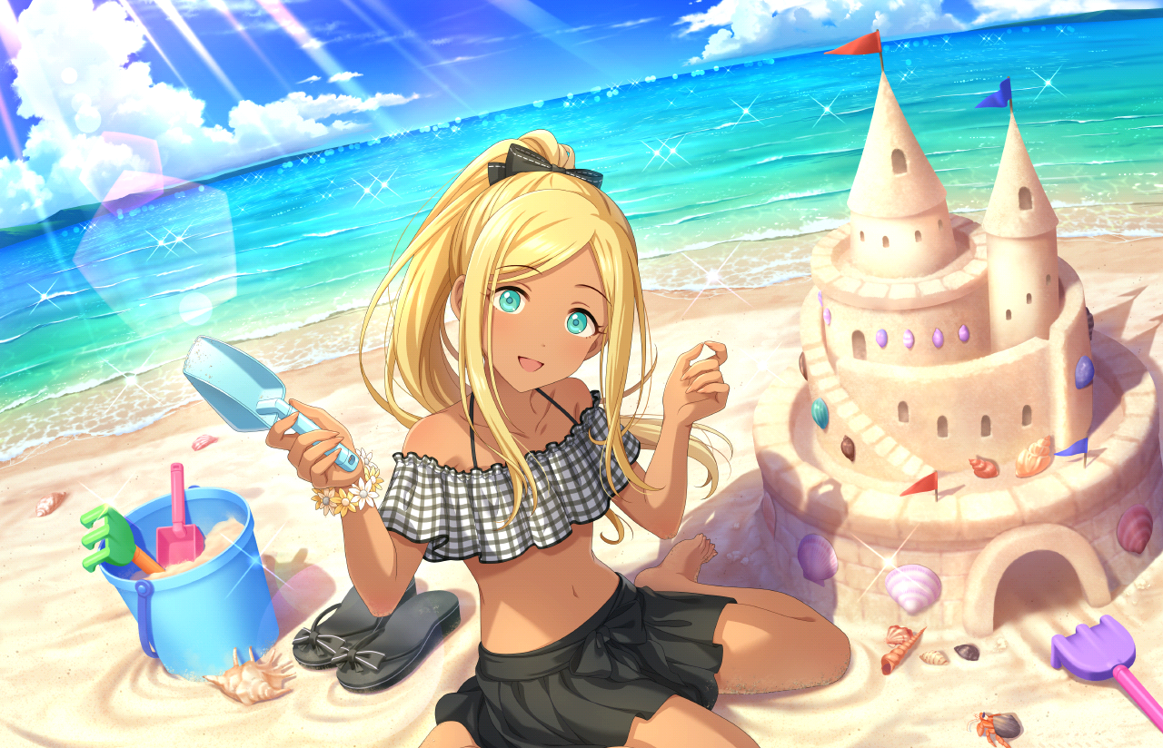 1girl beach bikini blonde_hair blue_eyes bracelet bucket cloud dark_skin feet flip-flops game_cg hair_ornament idolmaster idolmaster_cinderella_girls idolmaster_cinderella_girls_starlight_stage jewelry layla_(idolmaster) navel ocean official_art ponytail sand_castle sand_sculpture sandals shell shovel solo swimsuit