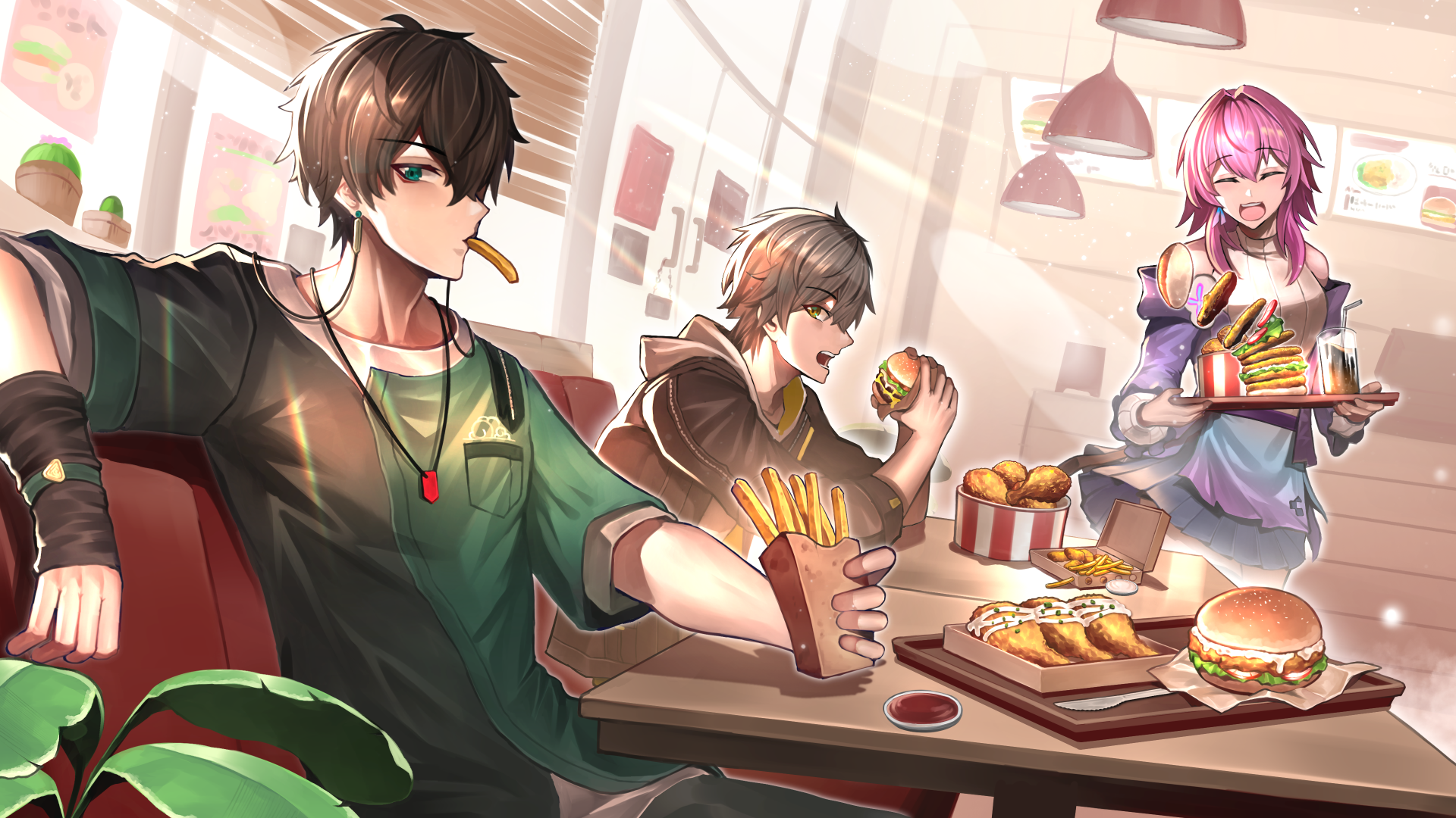 1girl 2boys belt blue_skirt burger caelus_(honkai:_star_rail) caelus_(world_tour_2023)_(honkai:_star_rail) chicken_(food) closed_eyes commentary dan_heng_(feast)_(honkai:_star_rail) dan_heng_(honkai:_star_rail) detached_sleeves drink earrings english_commentary food french_fries fried_chicken fu1ai gradient_clothes gradient_skirt high-waist_belt highres honkai:_star_rail honkai_(series) jacket jewelry layered_skirt march_7th_(feast)_(honkai:_star_rail) march_7th_(honkai:_star_rail) medium_hair miniskirt mixed-language_commentary multiple_boys official_alternate_costume pink_hair purple_jacket purple_skirt single_earring sitting skirt sleeveless sleeveless_sweater smile sweater table trailblazer_(honkai:_star_rail) white_skirt white_sleeves white_sweater
