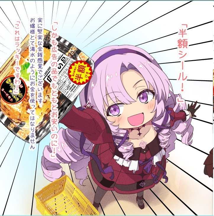 1girl detached_sleeves dress drill_hair food hyakumantenbara_salome hyakumantenbara_salome_(1st_costume) juliet_sleeves long_hair long_sleeves malino_(dream_maker) nijisanji open_mouth puffy_sleeves purple_eyes purple_hair red_dress shopping_cart smile solo translation_request virtual_youtuber