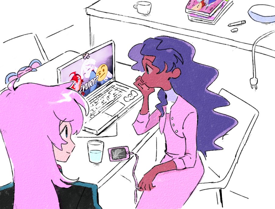 2girls blue_eyes cable cellphone chair chu_chu_(shoujo_kakumei_utena) closed_mouth computer cracked_screen cup dark-skinned_female dark_skin dress drinking_glass emoji english_text gundam gundam_suisei_no_majo hand_on_own_chin hand_up himemiya_anthy laptop long_hair long_sleeves looking_at_another manga_(object) meta miorine_rembran multiple_girls phone pink_dress pink_hair profile purple_hair ribitta shoujo_kakumei_utena sitting smartphone smile suletta_mercury table tenjou_utena upper_body watching white_background