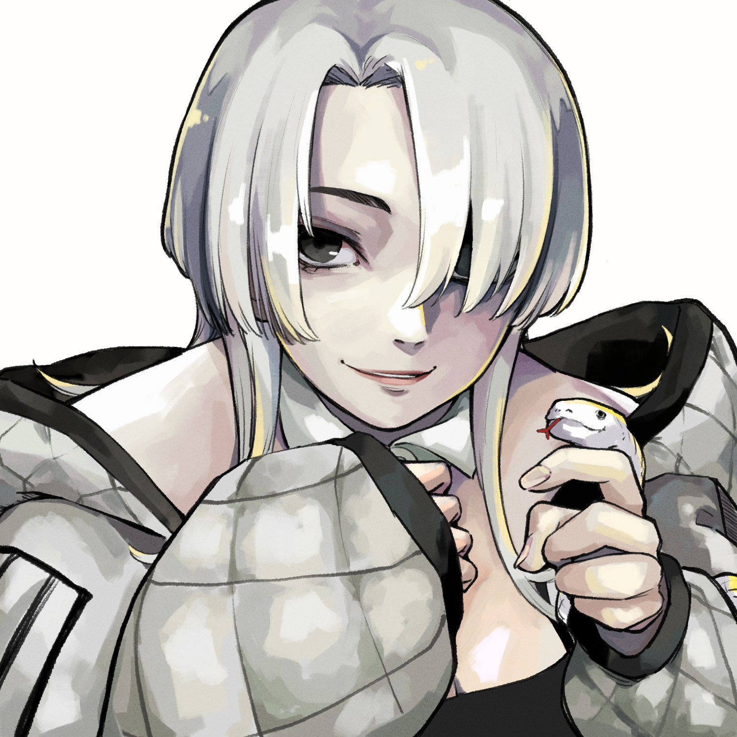 1girl argyle_clothes argyle_jacket bob_cut choujin_x closed_mouth cowlick cropped_torso grey_eyes grey_hair hair_between_eyes hair_over_one_eye highres jacket looking_at_viewer medium_hair one_eye_covered partially_unzipped petting short_hair short_hair_with_long_locks simple_background smile snake solo suit_jacket tsumuji_nari_(choujin_x) white_background white_hair white_snake yuma_kahara