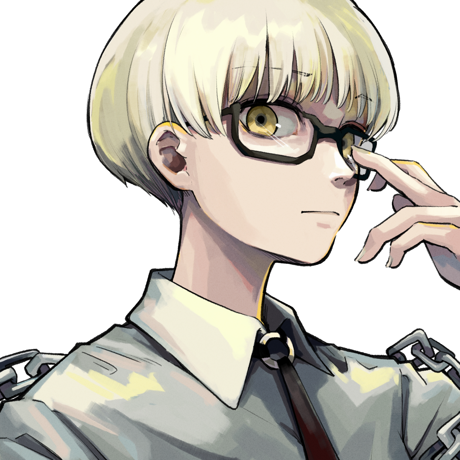 1boy adjusting_eyewear bespectacled black-framed_eyewear blonde_hair bowl_cut choujin_x closed_mouth collared_shirt cropped_torso glasses grey_eyes hand_on_eyewear higashi_azuma_(choujin_x) highres looking_at_viewer male_focus necktie serious shirt short_hair simple_background solo upper_body white_background white_shirt yellow_eyes yuma_kahara