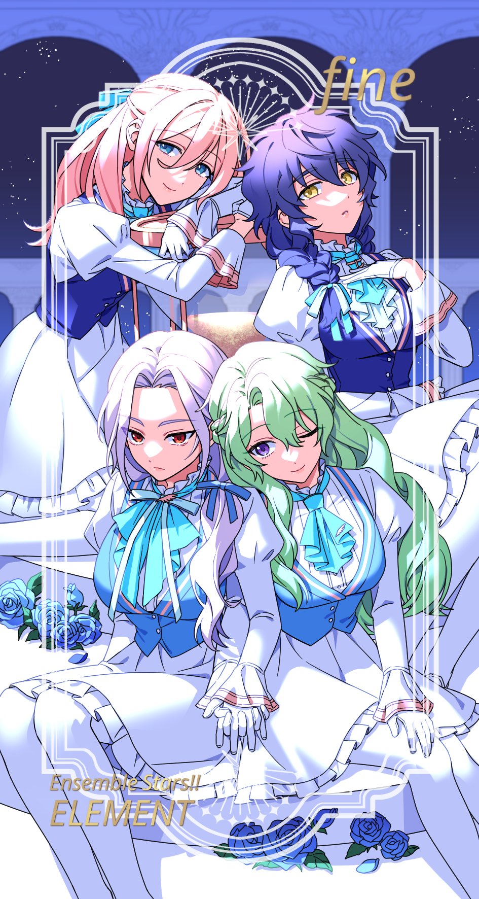 4girls aoba_tsumugi blonde_hair blue_corset blue_eyes blue_hair closed_mouth commentary_request corset dress ensemble_stars! fine_(ensemble_stars!) genderswap genderswap_(mtf) gloves green_hair group_name hand_on_own_chest highres holding_hands korean_commentary long_sleeves multiple_girls purple_eyes ran_nagisa red_eyes smile tenshouin_eichi tomoe_hiyori unworn_eyewear white_dress white_gloves white_hair xpstydlsrkddlcl yellow_eyes
