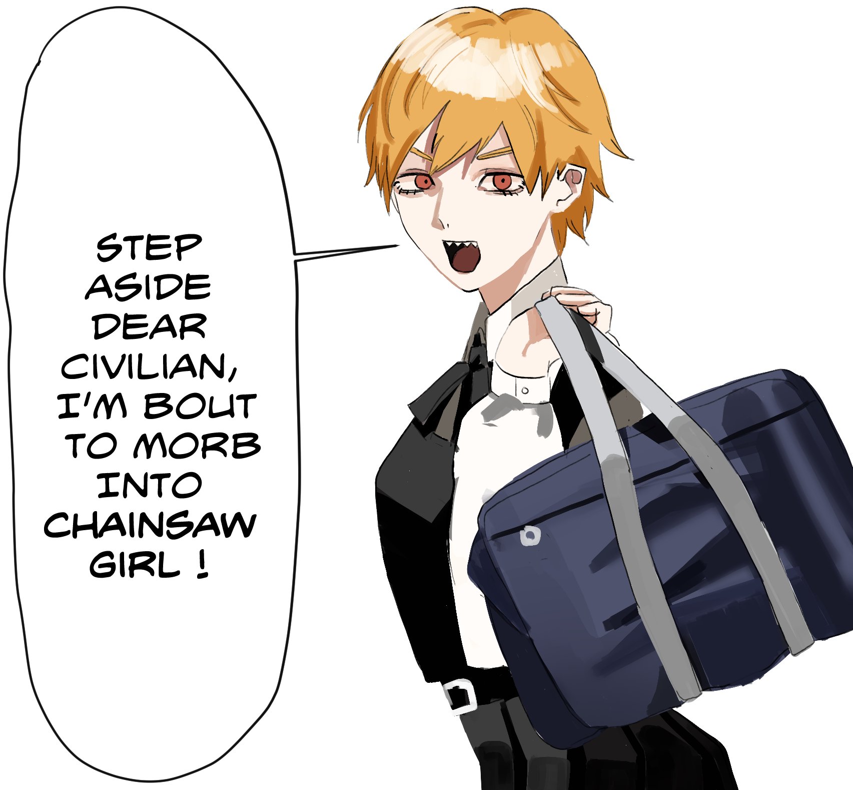 1girl bag chainsaw_man commentary denji_(chainsaw_man) dress english_commentary english_text fourth_east_high_school_uniform genderswap genderswap_(mtf) highres holding holding_bag it's_morbin'_time_(meme) meme mykokampfwagen open_mouth orange_hair pinafore_dress red_eyes school_bag school_uniform sharp_teeth short_hair sleeveless sleeveless_dress solo teeth upper_body