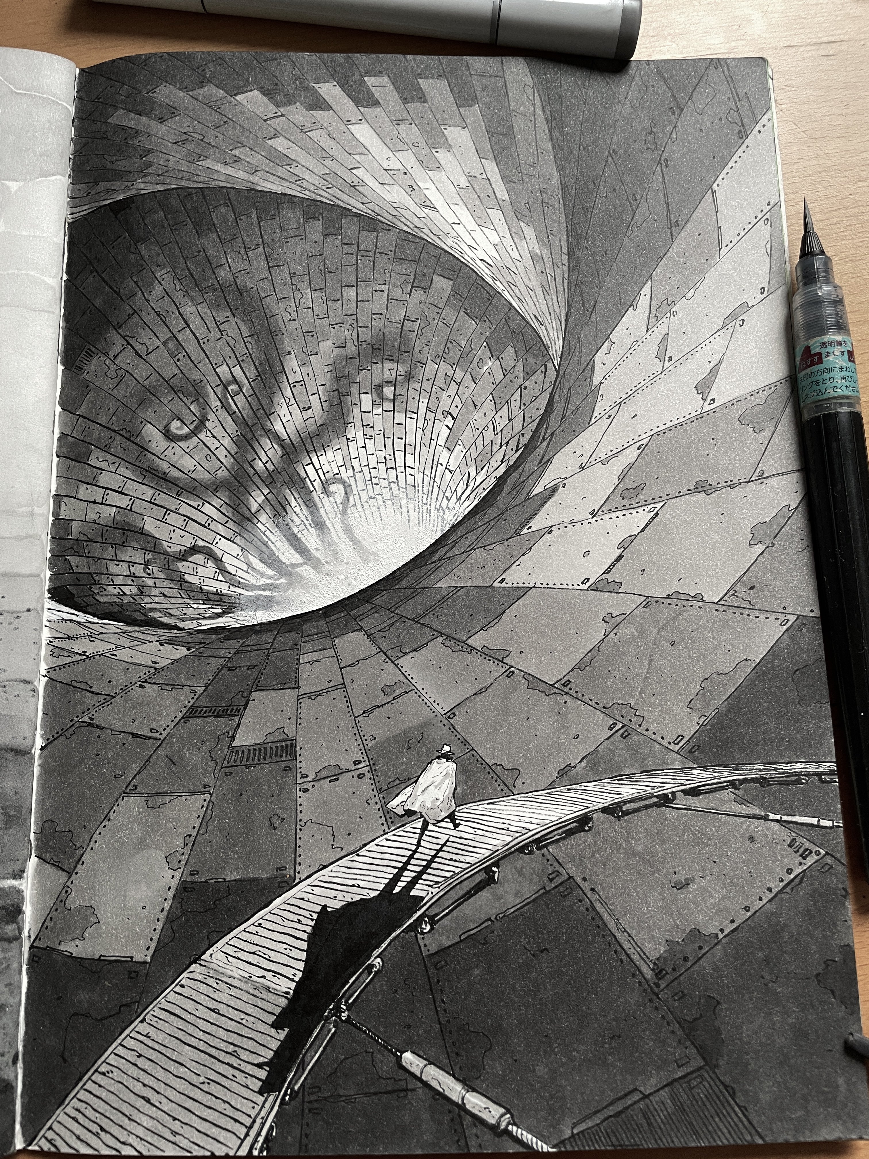 1boy absurdres art_tools_in_frame bridge cave cloak commentary fedora greyscale hat highres ink_(medium) luan_tie male_focus monochrome monster original photo_(medium) traditional_media tunnel