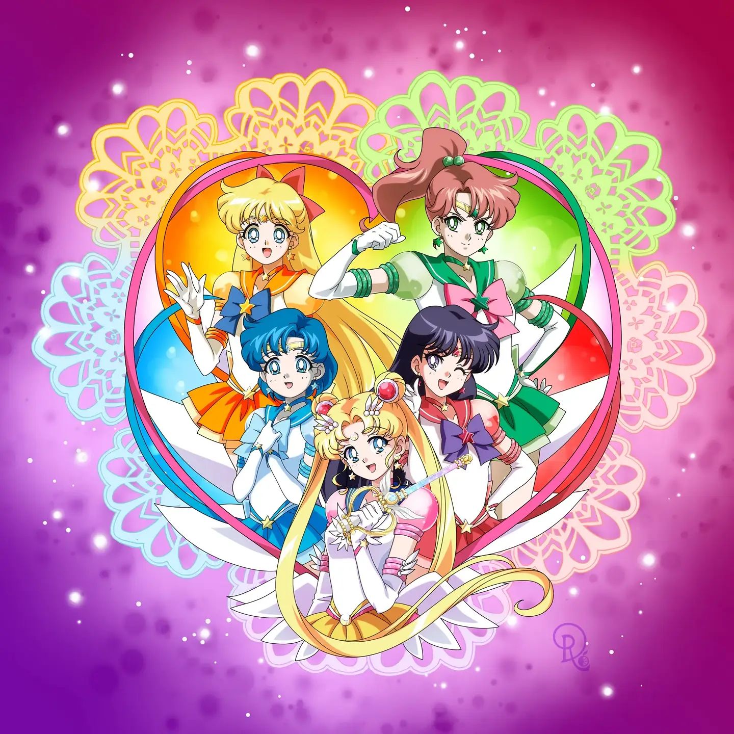 5girls aino_minako bishoujo_senshi_sailor_moon blonde_hair blue_eyes blue_hair brown_hair drachea_rannak earrings gloves green_eyes heart highres hino_rei jewelry kino_makoto long_hair magical_girl miniskirt mizuno_ami multiple_girls one_eye_closed ponytail purple_hair sailor_jupiter sailor_mars sailor_mercury sailor_moon sailor_venus short_hair short_sleeves skirt super_sailor_jupiter_(stars) super_sailor_mars_(stars) super_sailor_mercury_(stars) super_sailor_moon super_sailor_venus_(stars) tsukino_usagi very_long_hair wink