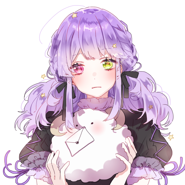 1girl ahoge black_dress black_ribbon blush braid closed_mouth coco_079 commentary dot_nose dress envelope expressionless eyes_visible_through_hair frilled_dress frilled_sleeves frills hair_ribbon head_tilt heterochromia holding holding_stuffed_toy light_frown long_hair looking_at_viewer original pink_eyes pink_pupils puffy_short_sleeves puffy_sleeves purple_hair ribbon short_sleeves sidelocks simple_background solo star_(symbol) stuffed_animal stuffed_sheep stuffed_toy twintails upper_body white_background yellow_eyes yellow_pupils