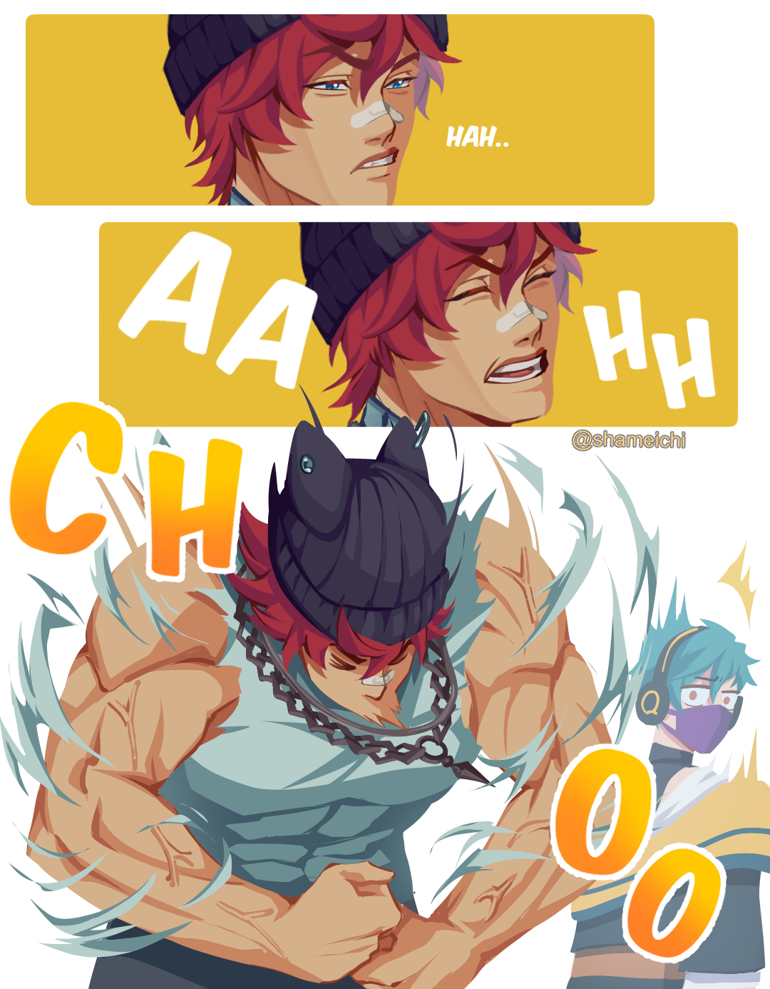>_< 2boys aphelios bandaid bandaid_on_face bandaid_on_nose bara closed_eyes grey_pants grey_shirt hat heartsteel_aphelios heartsteel_sett highres jewelry large_pectorals league_of_legends looking_at_another male_focus multiple_boys muscular muscular_male necklace official_alternate_costume pants pectorals red_hair sett_(league_of_legends) shameichi shirt short_hair torn_clothes torn_shirt twitter_username