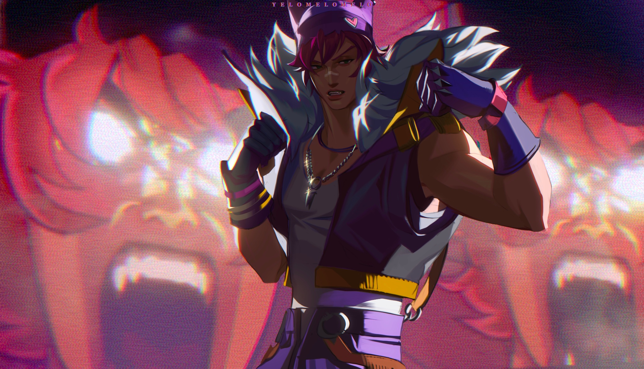 1boy bandaid bandaid_on_face bandaid_on_nose black_gloves black_jacket black_pants chadetteisgiga clenched_hands fur-trimmed_jacket fur_trim gloves hat heartsteel_(league_of_legends) heartsteel_sett highres jacket jewelry large_pectorals league_of_legends male_focus muscular muscular_male necklace open_clothes open_jacket pants pectorals pink_hair sett_(league_of_legends) short_hair sleeveless sleeveless_jacket solo tank_top teeth white_tank_top