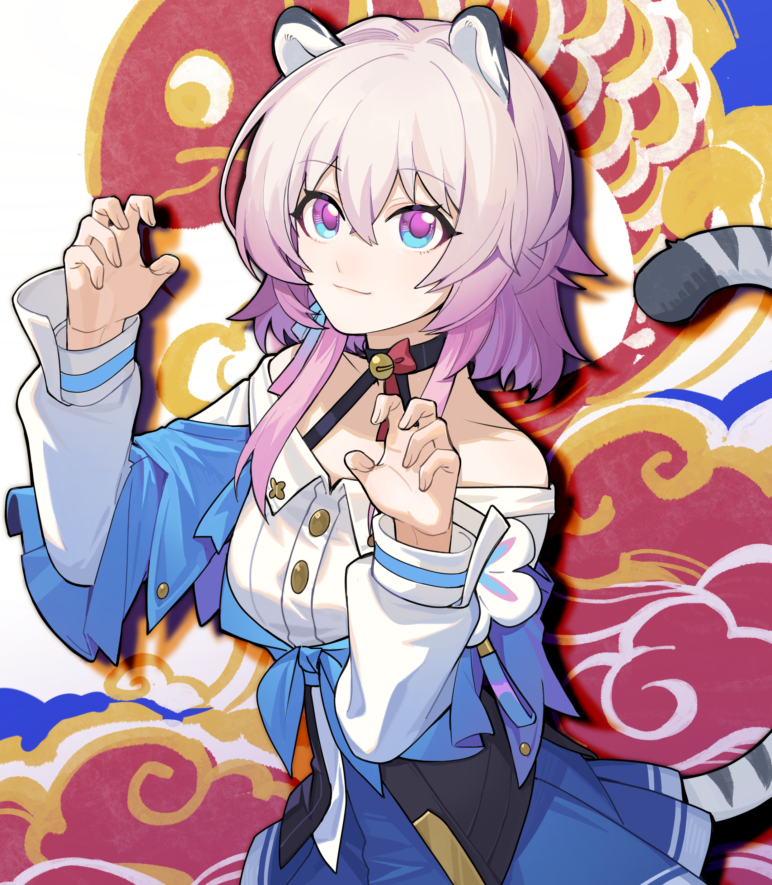 1girl absurdres animal_ears bare_shoulders black_choker black_corset blue_eyes blue_jacket blue_skirt choker closed_mouth corset cowboy_shot dress_shirt earrings flower_ornament hands_up highres honkai:_star_rail honkai_(series) jacket jewelry long_sleeves march_7th_(honkai:_star_rail) march_7th_(preservation)_(honkai:_star_rail) medium_hair miniskirt multicolored_eyes off_shoulder pink_eyes pink_hair pleated_skirt shirt single_earring skirt solo tail tail_under_clothes tied_jacket tiger_ears tiger_tail tuiqiao two-tone_eyes white_shirt