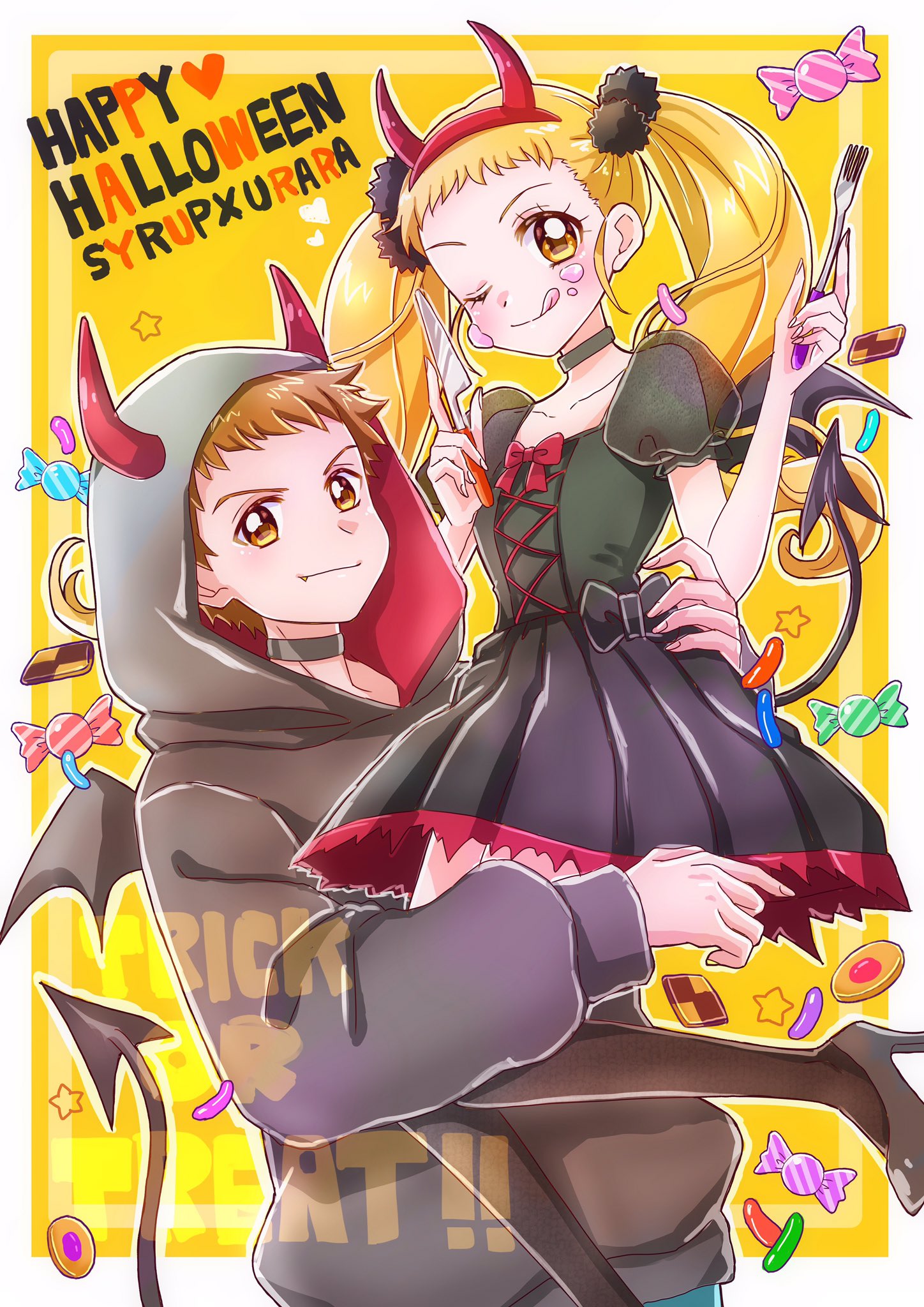 1boy 1girl :q black_choker black_dress black_footwear black_hoodie black_scrunchie black_thighhighs black_wings blonde_hair brown_eyes brown_hair candy character_name choker commentary demon_horns demon_tail demon_wings dress fake_horns fake_tail fang food food_on_face fork hair_ornament hair_scrunchie happy_halloween hetero high_heels highres holding_utensil hood hood_up hoodie horns kasugano_urara_(precure) knife lifting_person long_hair long_sleeves momo02634 precure puffy_short_sleeves puffy_sleeves scrunchie short_dress short_hair short_sleeves standing syrup_(precure) tail thighhighs tongue tongue_out trick_or_treat twintails very_short_hair wings wrapped_candy yellow_eyes yes!_precure_5 yes!_precure_5_gogo!
