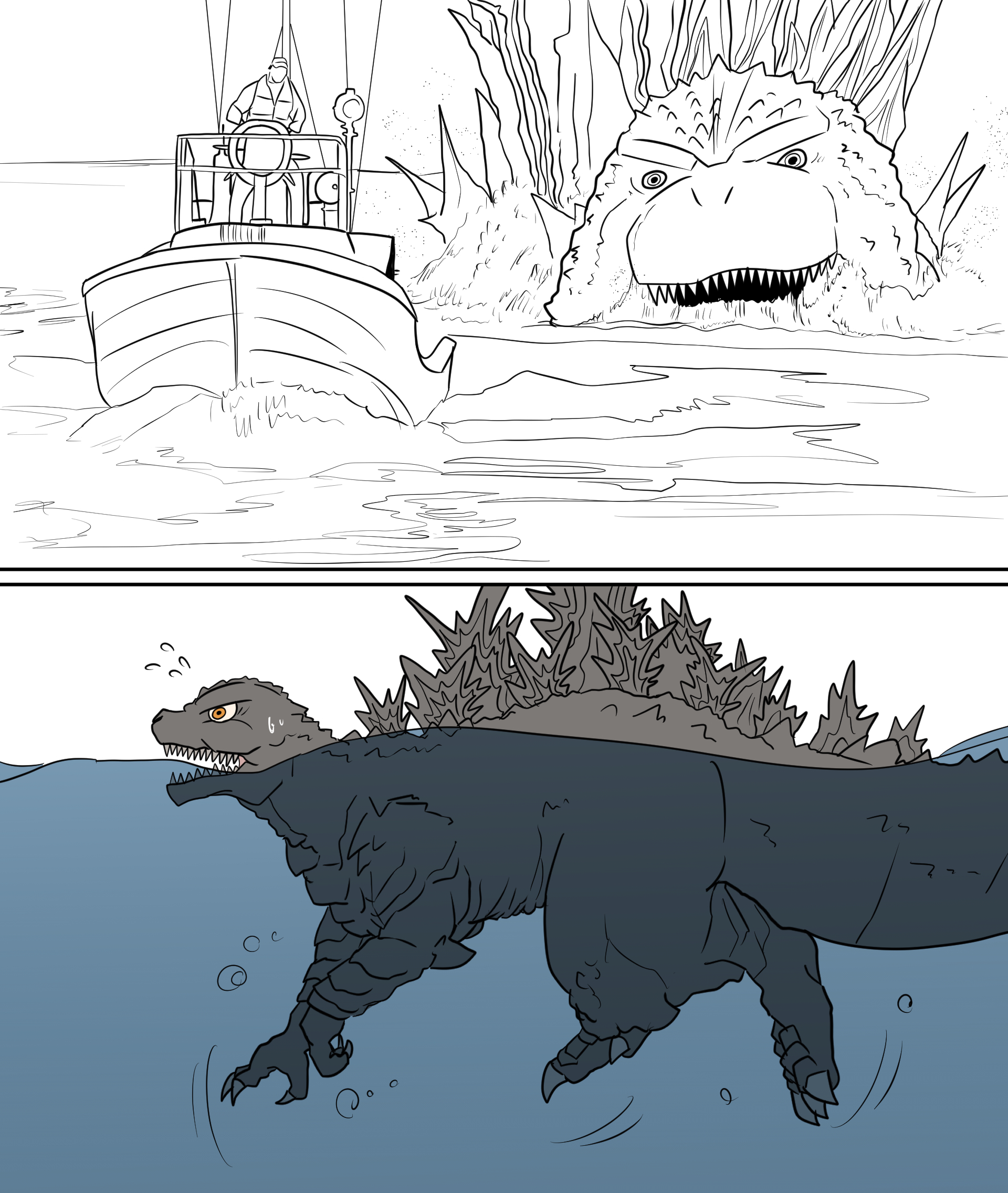 1boy akitsu_seiji boat bubble chasing claws dinosaur dog_paddle giant giant_monster godzilla godzilla_(series) godzilla_chasing_boat_(meme) godzilla_minus_one highres ibuki_(tulta_icon) kaiju meme minesweeper_(ship) monster ocean open_mouth partially_submerged partially_underwater_shot sea_monster searchlight sharp_teeth shinseimaru spikes sweatdrop swimming tail teeth toho underwater water watercraft yellow_eyes