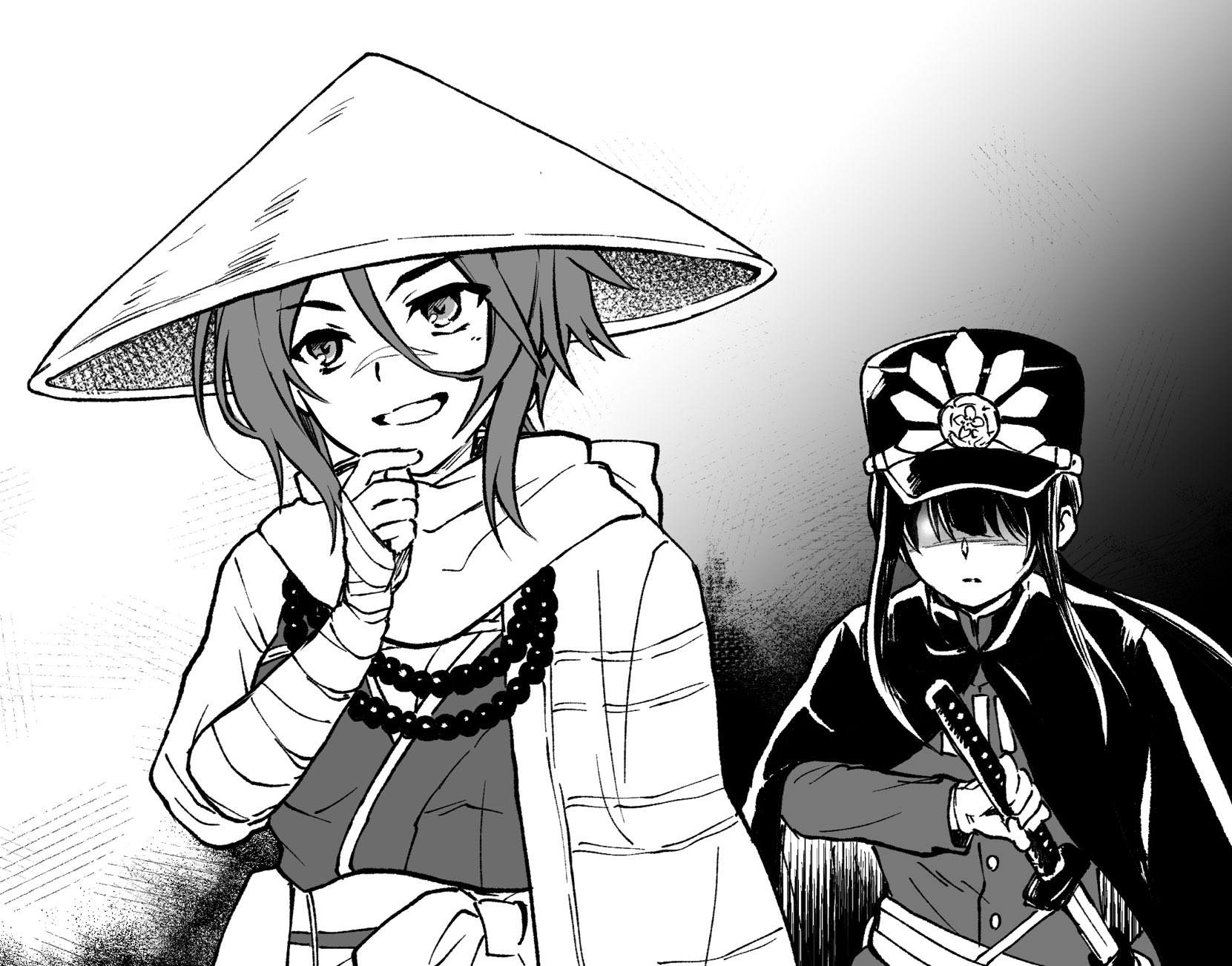 ajirogasa bandages bead_necklace beads drawing_sword fate/grand_order fate_(series) greyscale hat highres holding holding_sword holding_weapon jewelry katana monochrome necklace oda_nobukatsu_(fate) scar scar_on_face scar_on_nose sugitani_zenjubou_(fate) sugitani_zenjubou_(second_ascension)_(fate) sword tachitsu_teto weapon