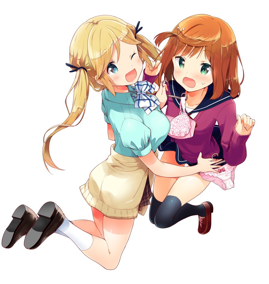 2girls black_ribbon black_socks blonde_hair blue_eyes blue_shirt blue_skirt bob_cut bow bowtie bra breasts brown_hair brown_skirt hair_ornament hair_ribbon hairclip kneehighs kosaka_geraldine light_blush lingerie long_hair majime_girl_to_seishun_lingerie medium_breasts multiple_girls official_art open_mouth panties ribbon school_uniform shirt short_hair skirt small_breasts smile socks tachi_(gutsutoma) twintails umemiya_ran underwear white_socks yuri