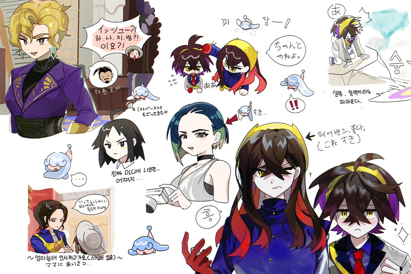 ! !! 2boys 5girls :< ahoge arrow_(symbol) black_hair blonde_hair blue_jacket briar_(pokemon) buttons camera carmine_(pokemon) cheren_(pokemon) closed_mouth commentary_request earrings gen_8_pokemon hair_between_eyes hairband hatenna holding holding_camera jacket jewelry juliana_(pokemon) kieran_(pokemon) korean_commentary long_hair majyo_(witch_poke) mole mole_under_mouth mother_(pokemon) multiple_boys multiple_girls multiple_views nintendo paldea_mother perrin_(pokemon) pokemon pokemon_(creature) pokemon_black_2_and_white_2 pokemon_scarlet_and_violet purple_jacket short_hair smile speech_bubble spoken_character translation_request yellow_hairband