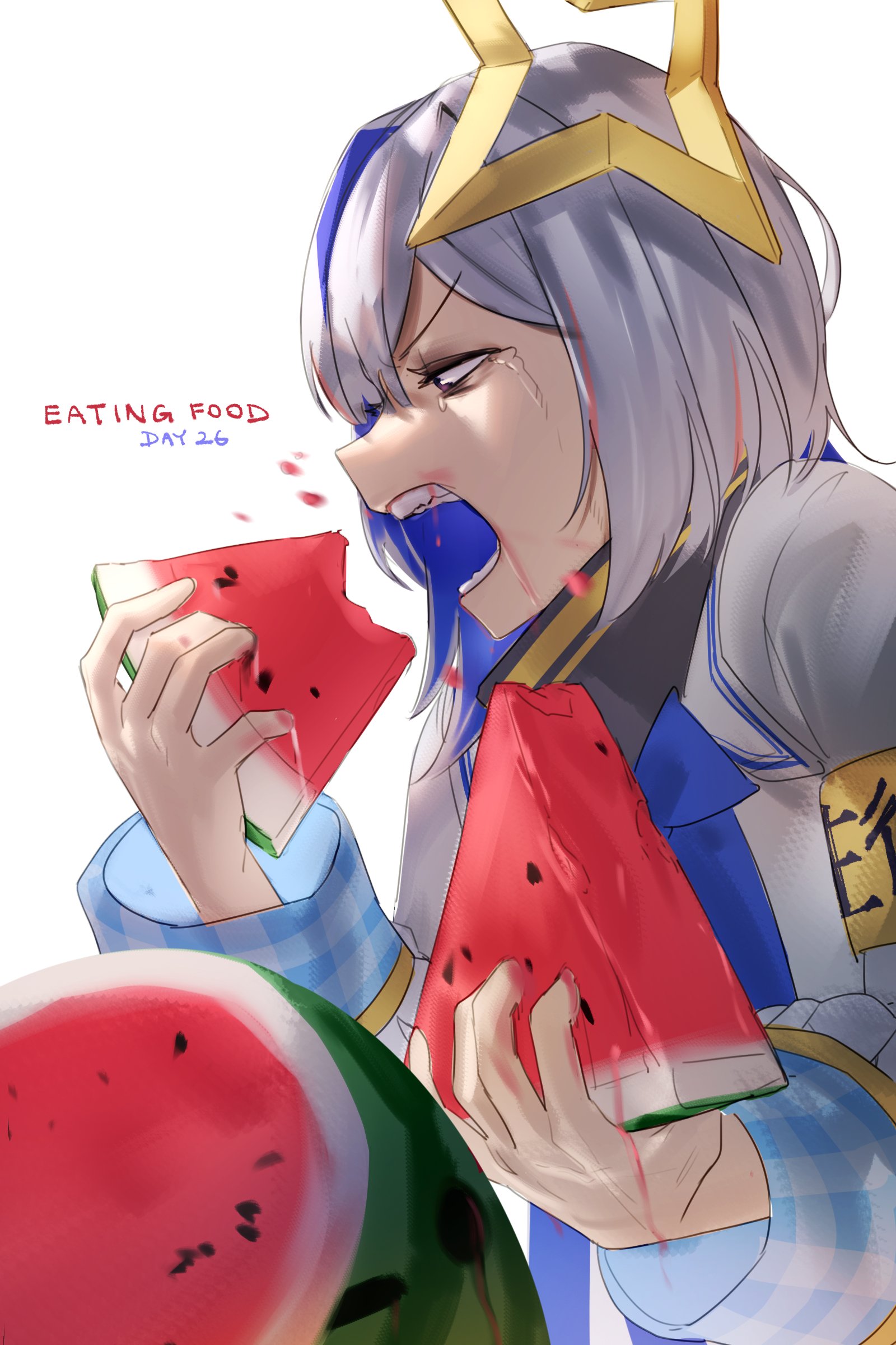 1girl absurdres amane_kanata amane_kanata_(1st_costume) aragiken blue_hair eating food fruit grey_hair halo highres hololive jacket long_sleeves multicolored_hair open_mouth short_hair simple_background solo star_halo tears virtual_youtuber watermelon white_background