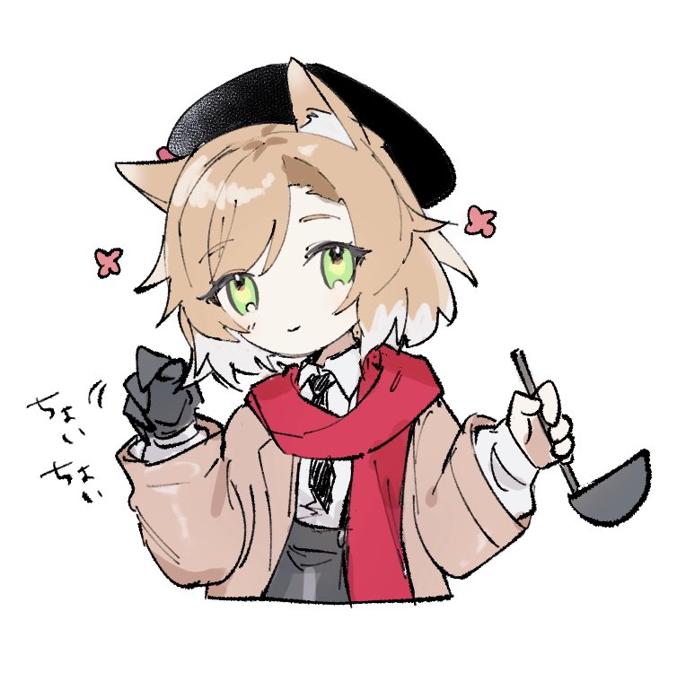 1girl animal_ear_fluff animal_ears arknights black_hat black_necktie brown_coat cat_ears closed_mouth coat cropped_torso green_eyes hat holding holding_ladle inu_to_milk ladle long_sleeves looking_at_viewer mousse_(arknights) mousse_(campfire_cooking_smoke)_(arknights) multicolored_hair necktie official_alternate_costume open_clothes orange_hair red_scarf scarf shirt short_hair smile solo two-tone_hair white_hair white_shirt