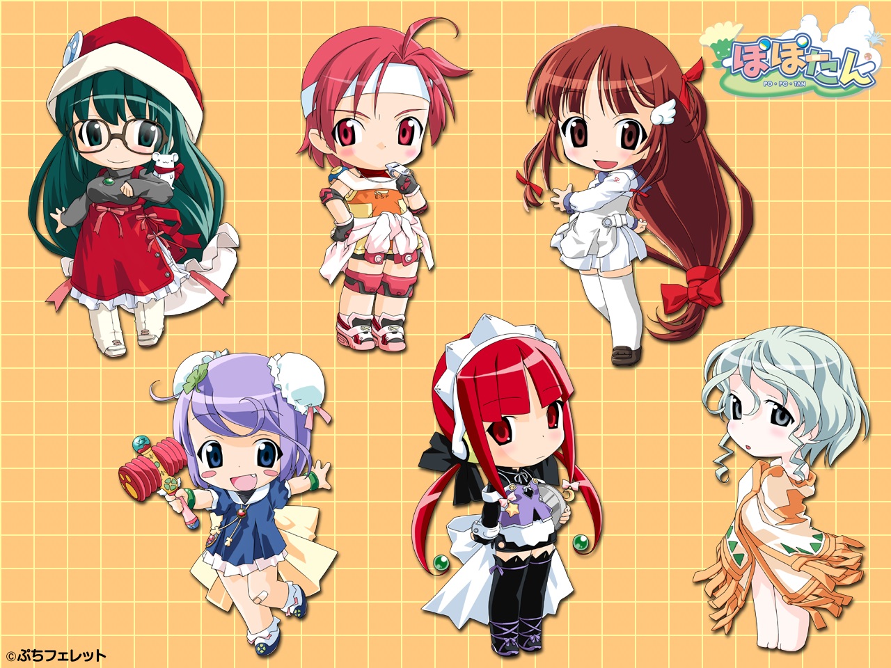 ai_(popotan) bandaid barefoot bike_shorts black_thighhighs blush_stickers brown_eyes brown_hair chibi child clover_hair_ornament double_bun dress fang glasses green_eyes green_hair hair_bun hair_ornament konami_(popotan) loafers mai_(popotan) maid mea_(popotan) mii_(popotan) poncho popotan red_dress red_eyes red_hair shizuku_(popotan) shoes thighhighs whistle white_dress white_hair white_thighhighs wing_hair_ornament wings
