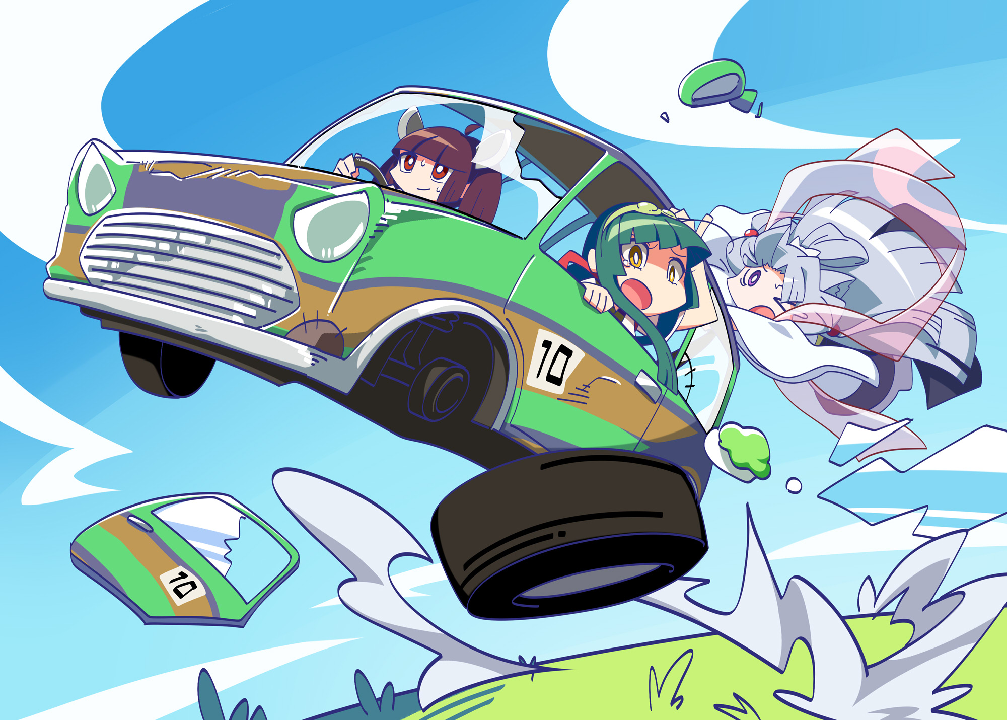 >_o 3girls blue_sky blunt_bangs bright_pupils broken_window brown_hair car commentary_request damaged day driving fuu_(koneko_no_yomeiri) grass green_hair green_hairband grey_hair hagoromo hairband hand_on_own_head hanging_on headgear highres japanese_clothes kimono knife long_hair long_sleeves looking_ahead looking_down midair motor_vehicle multiple_girls nervous_smile nervous_sweating one_eye_closed open_mouth purple_eyes red_eyes scared shawl siblings sisters sky smile sweat tasuki tearing_up through_window touhoku_itako touhoku_kiritan touhoku_zunko twintails unused_tire v-shaped_eyebrows voiceroid white_kimono white_pupils wide_sleeves yellow_eyes zunda_mochi