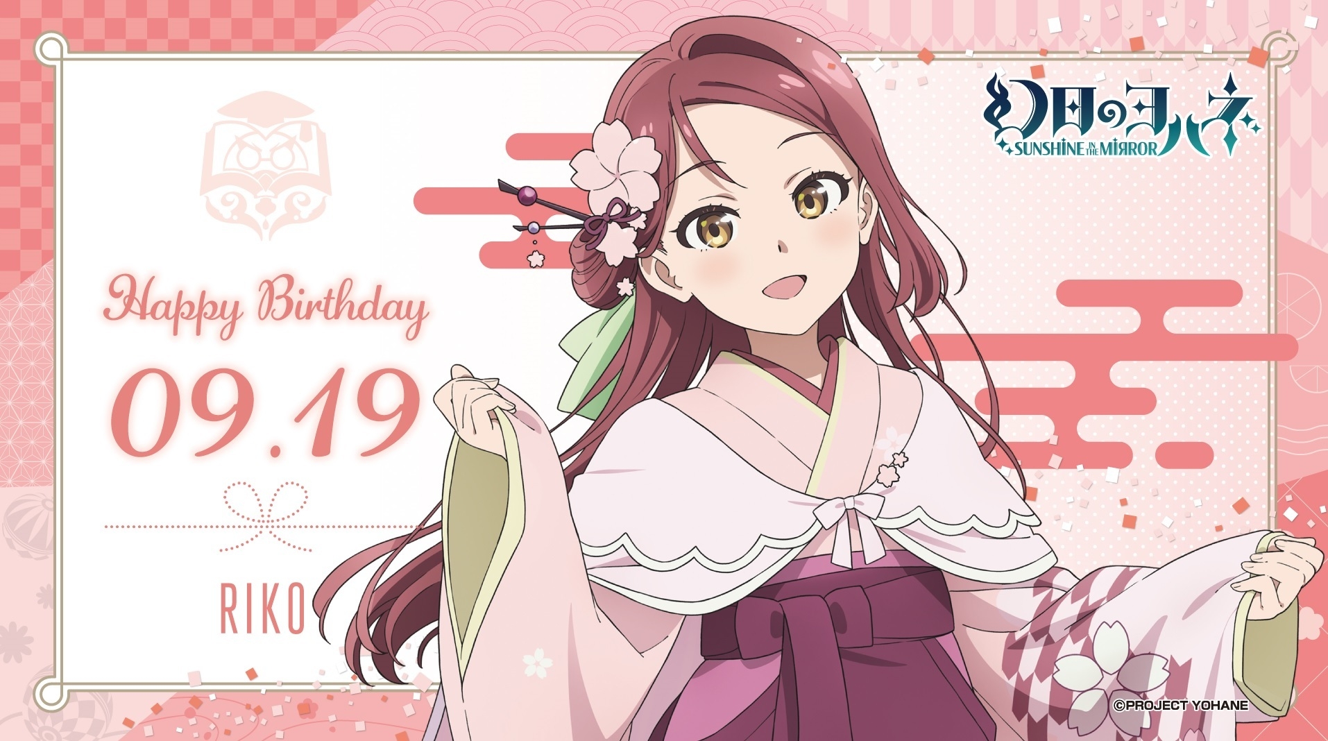 1girl copyright_logo egasumi floral_print flower genjitsu_no_yohane hair_bun hair_flower hair_ornament happy_birthday highres japanese_clothes logo long_hair long_sleeves looking_at_viewer love_live! love_live!_sunshine!! official_art open_mouth parted_hair red_hair riko_(genjitsu_no_yohane) sakurauchi_riko sleeves_past_wrists smile yellow_eyes