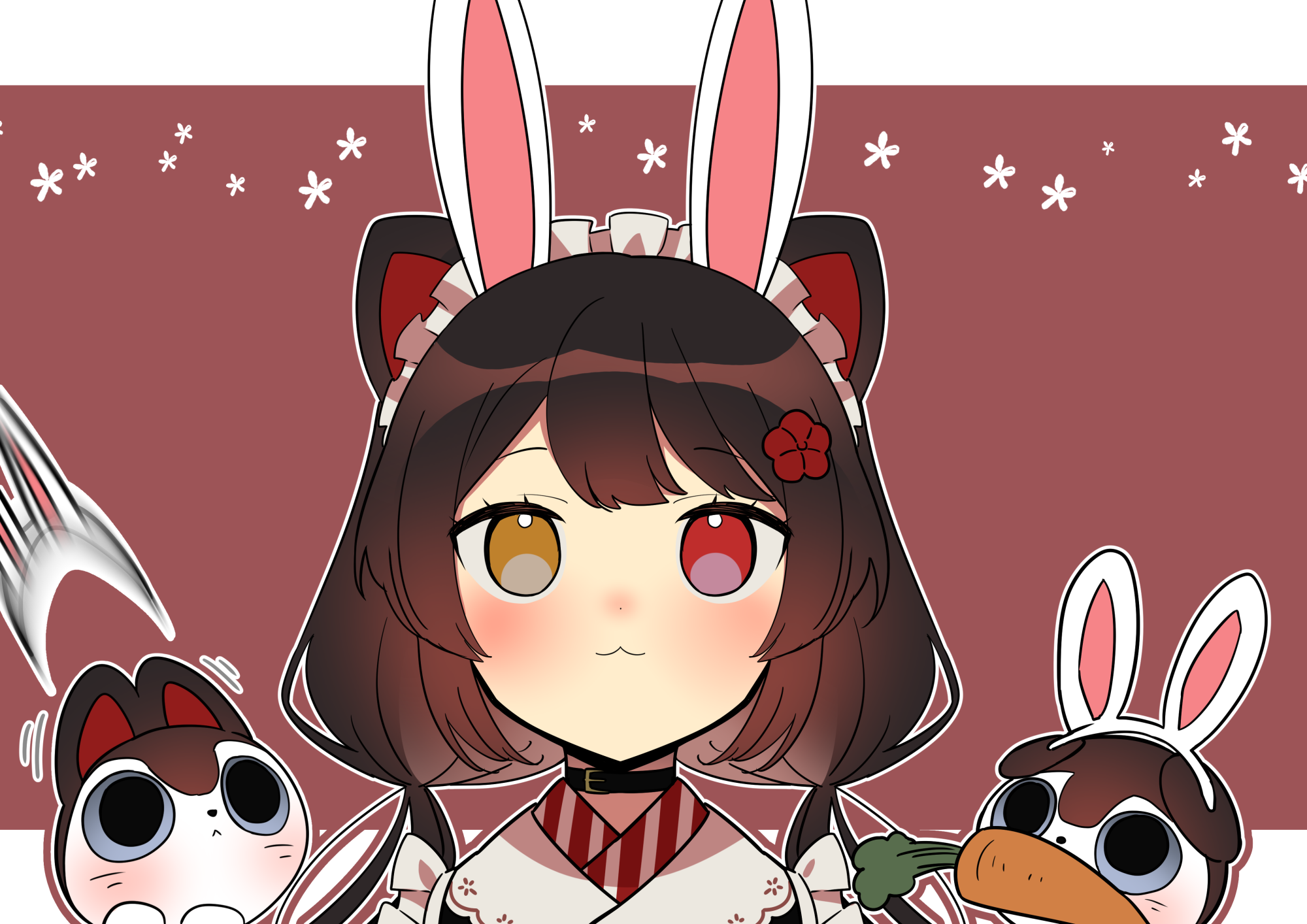 1girl :3 animal_ears black_collar black_hair brown_eyes collar commentary_request dog_ears fake_animal_ears flower hair_flower hair_ornament hairband heterochromia highres inui_toko japanese_clothes lanlanlap low_twintails maid maid_headdress nijisanji rabbit_ears red_eyes twintails virtual_youtuber wa_maid white_hairband
