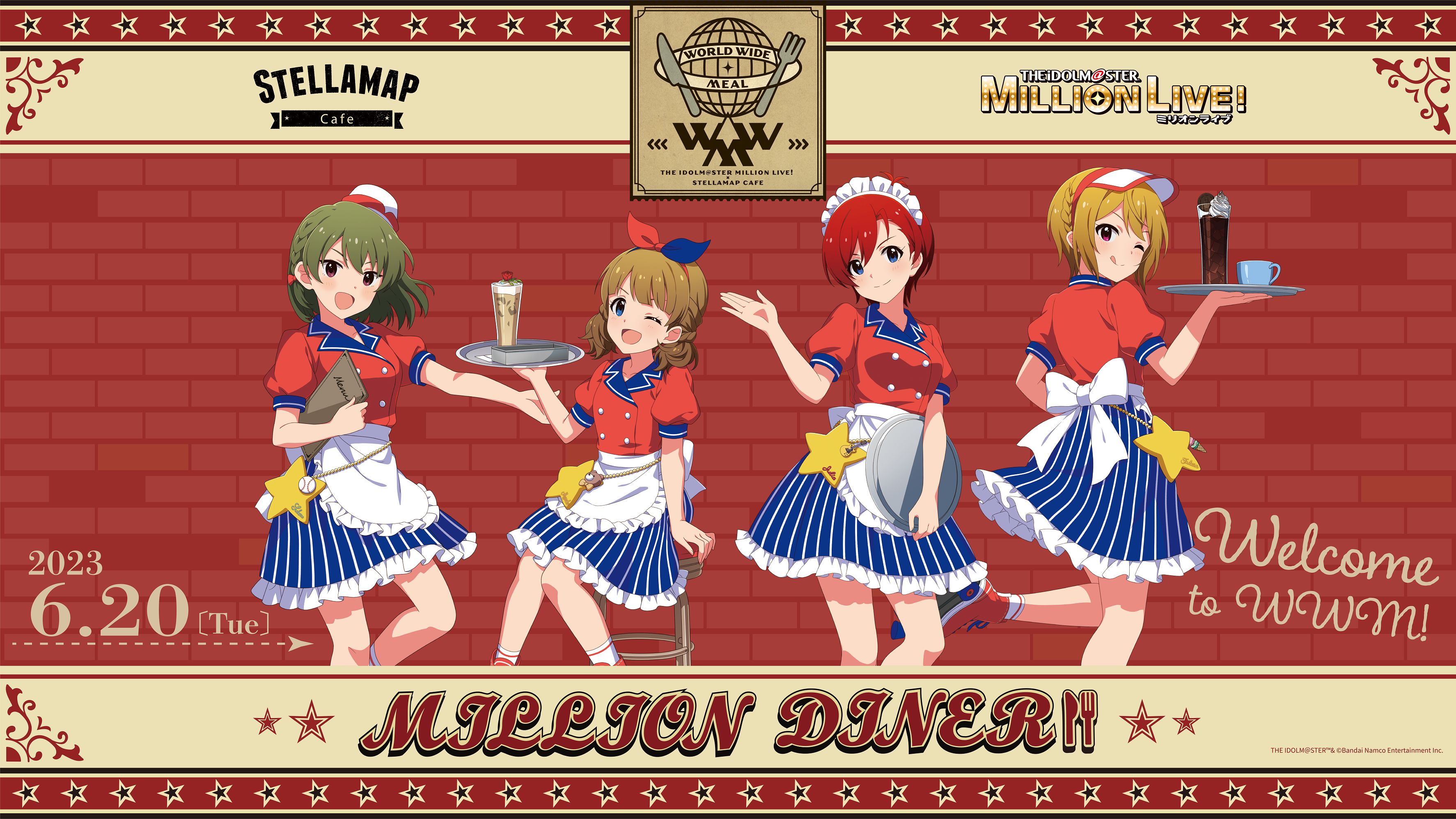 4girls absurdres apron blue_eyes brown_hair hat highres ibuki_tsubasa idolmaster idolmaster_million_live! idolmaster_million_live!_theater_days julia_(idolmaster) maid_headdress multiple_girls nagayoshi_subaru official_art promotional_art purple_eyes red_eyes stellamap_cafe suou_momoko tray waitress world_wide_meal_(idolmaster)