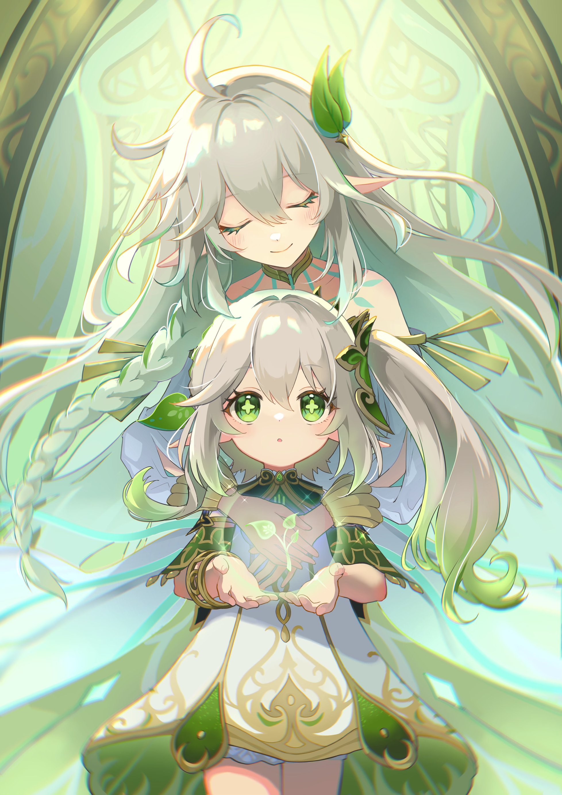 2girls :o absurdres ahoge bloomers blue_hair blush bracelet braid cape closed_eyes closed_mouth commentary_request cowboy_shot cross-shaped_pupils detached_sleeves dress eyelashes french_braid gem genshin_impact gold_trim gradient_hair green_cape green_dress green_eyes green_gem green_sleeves hair_between_eyes hair_intakes hair_ornament hands_on_another's_chest hands_up highres jewelry leaf_hair_ornament long_braid long_hair looking_at_viewer multicolored_hair multiple_girls nahida_(genshin_impact) parted_lips pinocle pointy_ears ponytail rukkhadevata_(genshin_impact) short_sleeves side_braid side_ponytail sidelocks single_braid sleeveless sleeveless_dress smile sparkle standing streaked_hair symbol-shaped_pupils tattoo twig underwear very_long_hair white_bloomers white_dress white_hair window