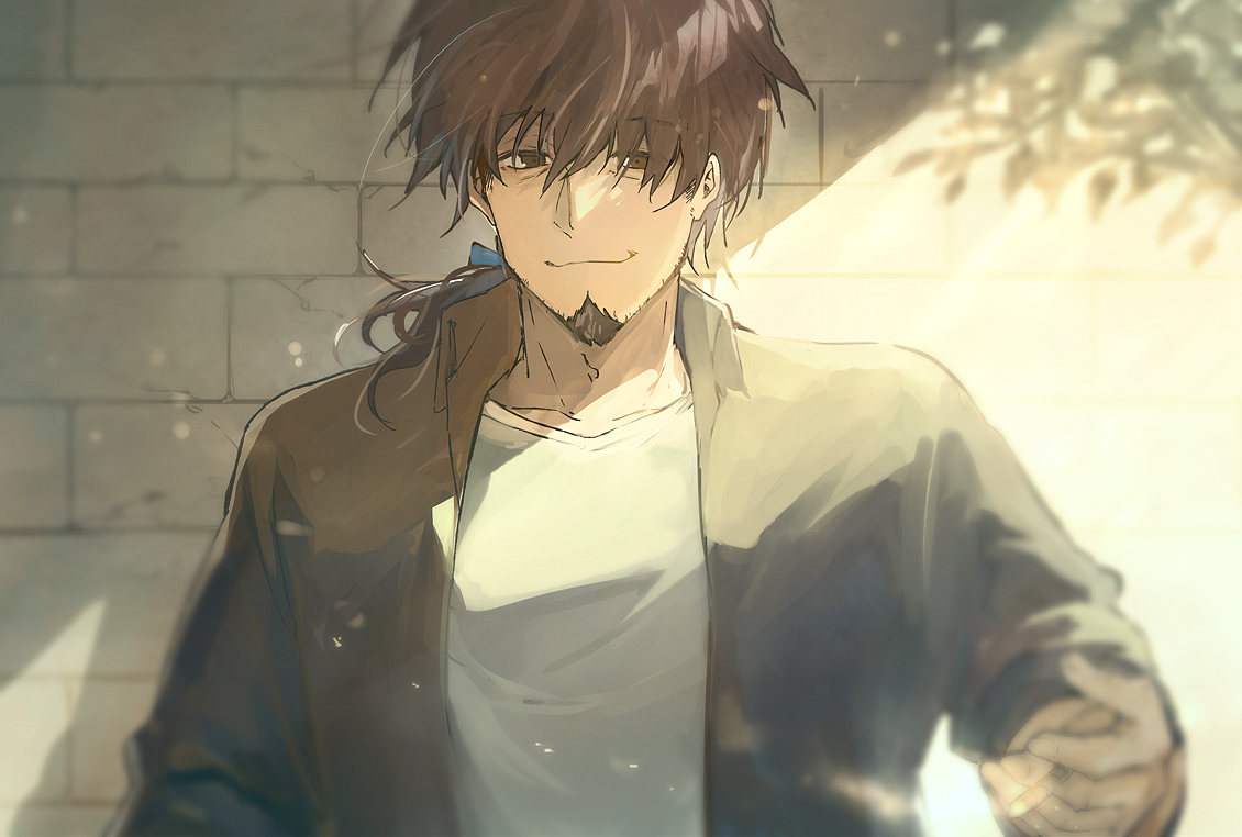 1boy black_jacket blue_ribbon brick_wall brown_eyes brown_hair closed_mouth collarbone facial_hair fate/grand_order fate_(series) goatee hair_ribbon hector_(fate) hector_(sheep_counting_lullaby)_(fate) jacket long_sleeves male_focus mature_male open_clothes open_jacket outdoors ponytail ribbon shirt solo sparse_stubble sunlight tumikilondon5 white_shirt