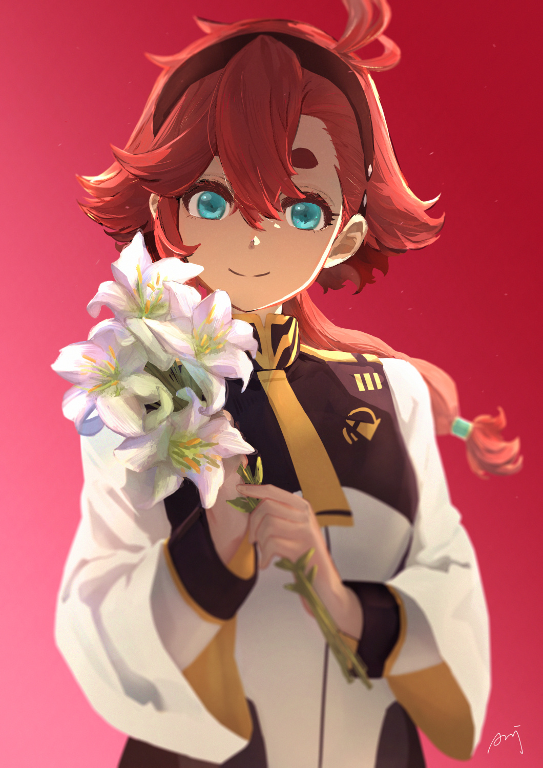 1girl ani_lu aqua_eyes asticassia_school_uniform black_hairband blue_eyes bouquet flower gradient_background gundam gundam_suisei_no_majo hair_between_eyes hairband highres holding holding_bouquet holding_flower lily_(flower) long_sleeves looking_at_viewer low_ponytail necktie ponytail red_background red_hair school_uniform signature simple_background solo suletta_mercury thick_eyebrows upper_body wide_sleeves yellow_necktie
