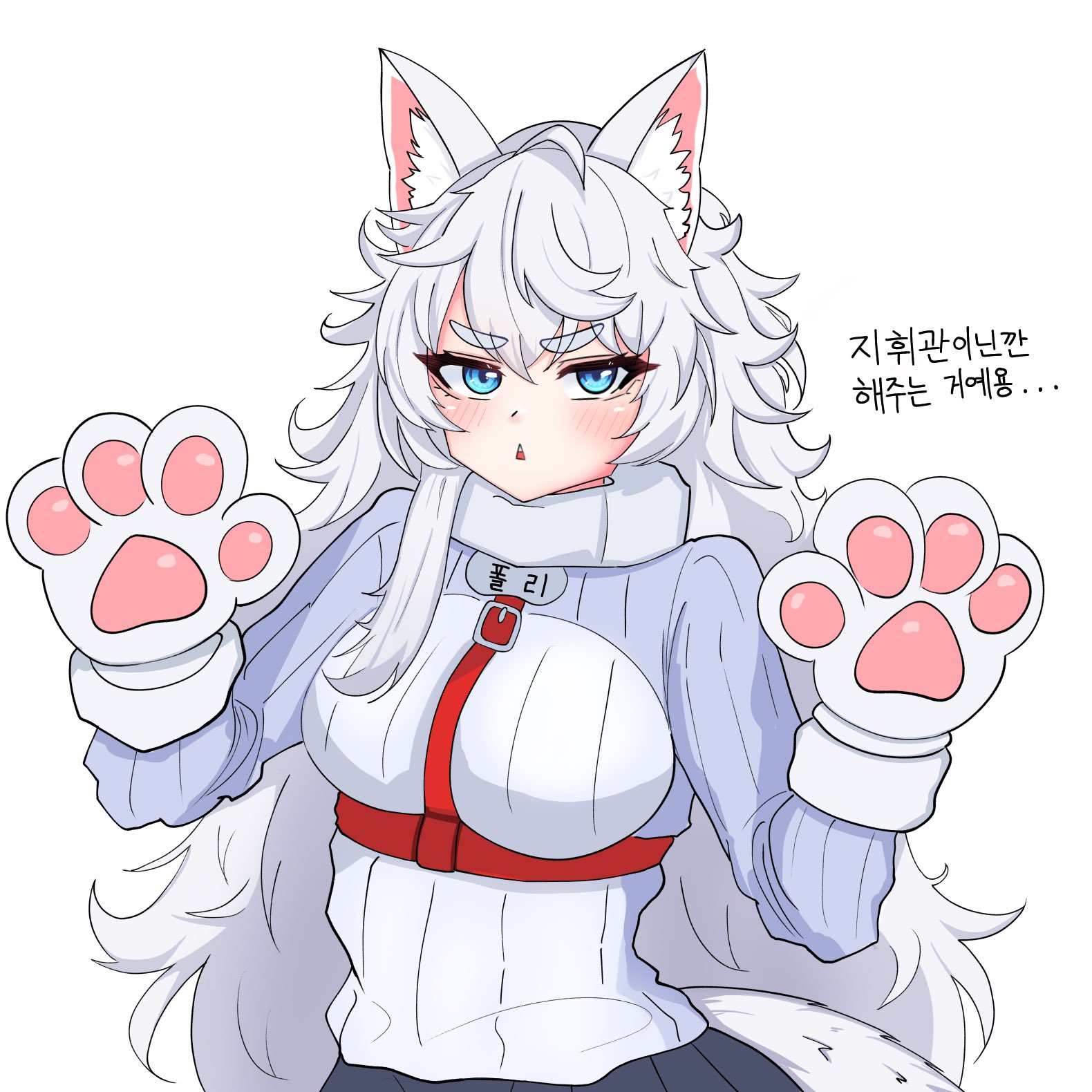 1girl animal_ears animal_hands blue_eyes blush breasts chest_harness gloves goddess_of_victory:_nikke harness highres long_hair medium_breasts paw_gloves paw_pose poli_(nikke) sidelocks solo sweater tail tengt_e triangle_mouth very_long_hair wavy_hair white_hair