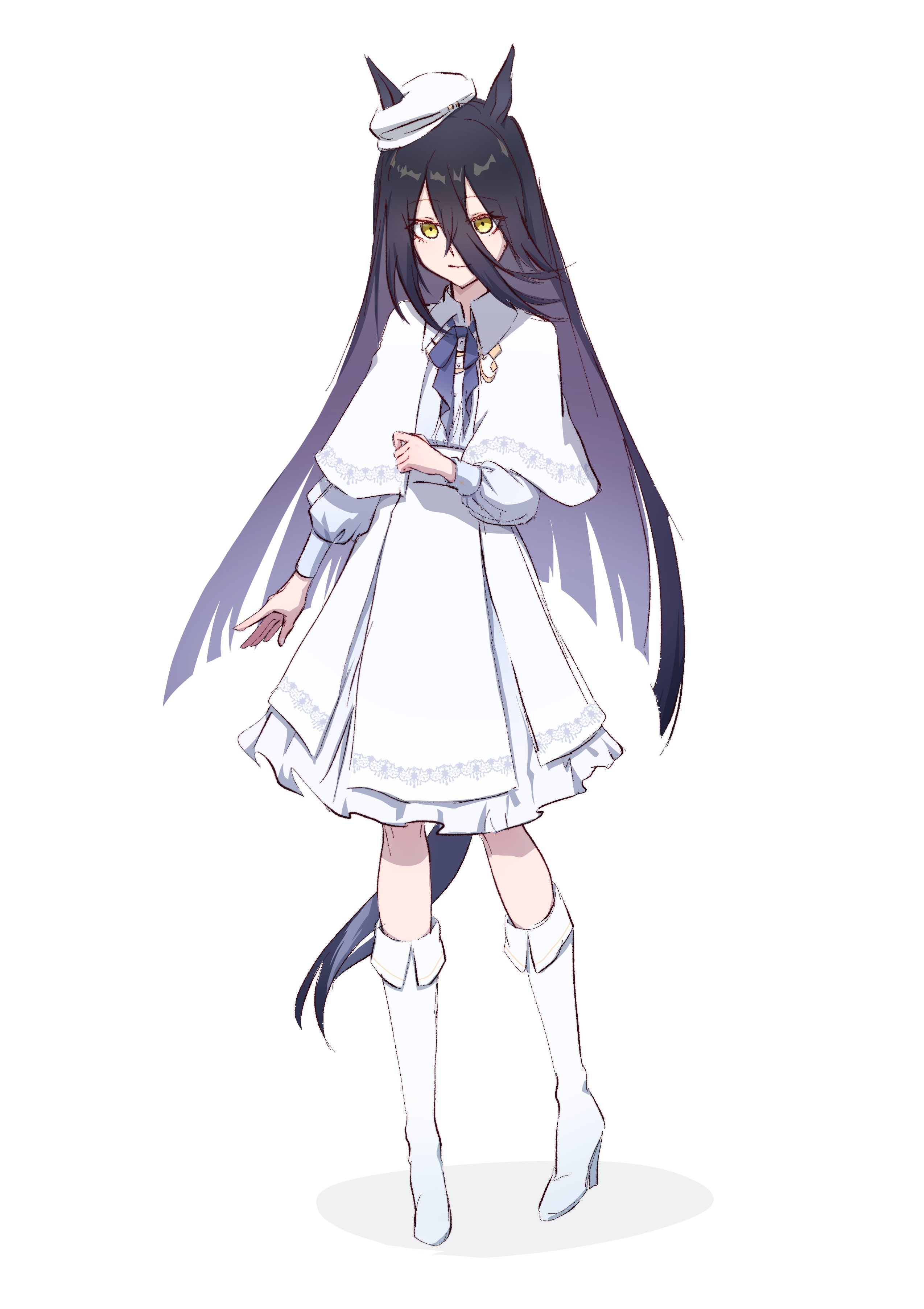 1girl absurdres alternate_costume animal_ears black_hair boots bow bowtie capelet closed_mouth collared_shirt ears_through_headwear full_body hair_between_eyes hand_up hat high_heels highres horse_ears horse_girl horse_tail knee_boots long_hair long_sleeves manhattan_cafe_(umamusume) shirt simple_background skirt smile solo tail umamusume watou white_background white_boots white_hat white_skirt yellow_eyes