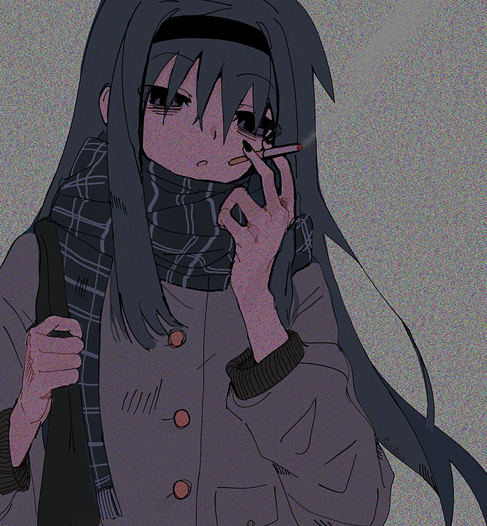 1girl akemi_homura black_hairband black_nails blue_scarf cigarette empty_eyes green_hair grey_jacket hairband highres holding holding_cigarette jacket long_hair mahou_shoujo_madoka_magica multicolored_background r_(reijibnuy2) scarf smoking solo static