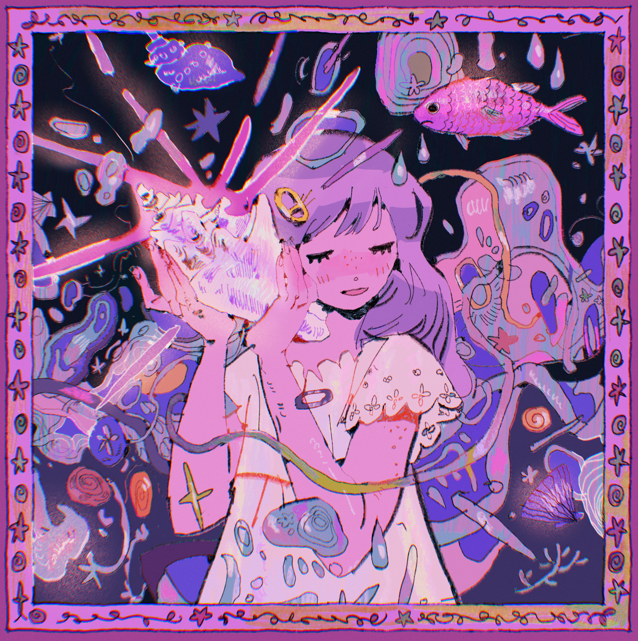 1girl border closed_eyes commentary conch dress english_commentary fish hair_ornament highres holding holding_shell long_hair original procreate_(medium) purple_hair seashell shell short_sleeves solo soupandcats star_(symbol) upper_body white_dress