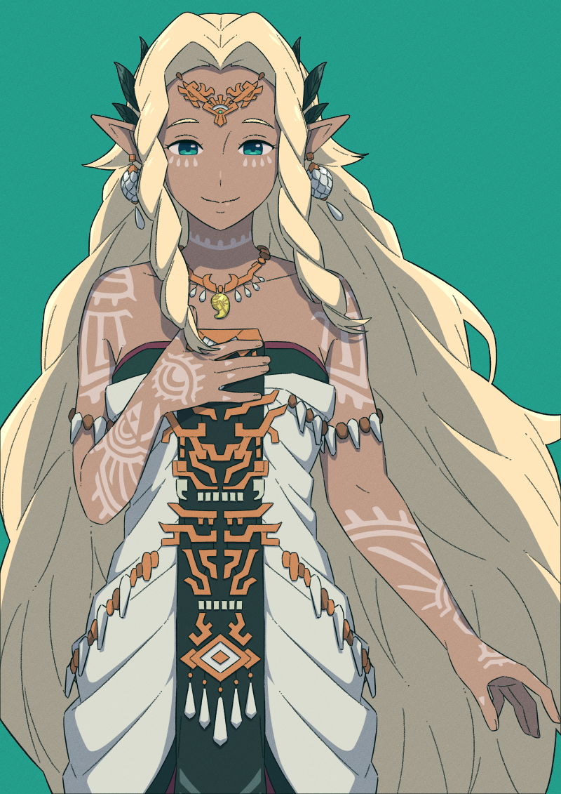 1girl blonde_hair body_markings braid braided_sidelock circlet dot_nose dress earrings facial_mark green_background green_eyes hinoyama_kou jewelry long_hair looking_at_viewer magatama magatama_necklace necklace nintendo pointy_ears simple_background smile solo sonia_(zelda) the_legend_of_zelda the_legend_of_zelda:_tears_of_the_kingdom very_long_hair white_dress