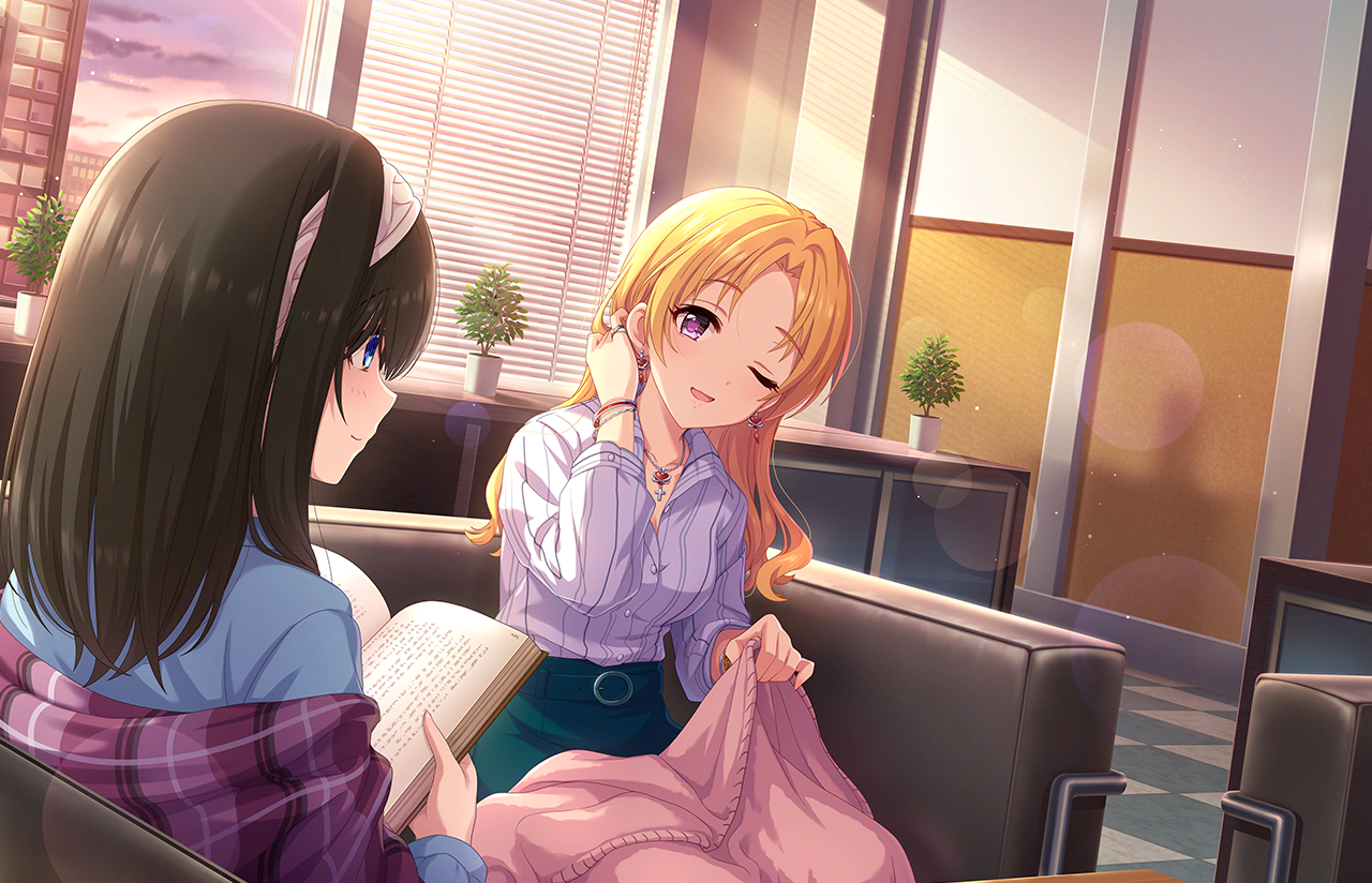2girls :d artist_request black_hair blonde_hair blue_eyes blue_shirt blue_skirt blush bracelet chair game_cg hairband idolmaster idolmaster_cinderella_girls indoors jewelry kiryu_tsukasa_(idolmaster) lens_flare long_hair looking_at_viewer medium_hair multiple_girls official_art one_eye_closed open_mouth parted_bangs pink_blanket plant potted_plant purple_eyes purple_shawl purple_shirt ring sagisawa_fumika shawl shirt sitting skirt smile white_hairband window window_blinds