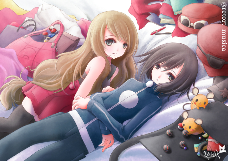 1boy 1girl bag black_hair blue_jacket book calem_(pokemon) dedenne eyewear_on_headwear gen_6_pokemon hat jacket light_brown_hair looking_at_viewer luxury_ball lying nintendo poke_ball poke_ball_(basic) pokemon pokemon_(creature) pokemon_x_and_y red_skirt serena_(pokemon) shopping_bag sirius. skirt smile sunglasses tail thighhighs unworn_hat unworn_headwear