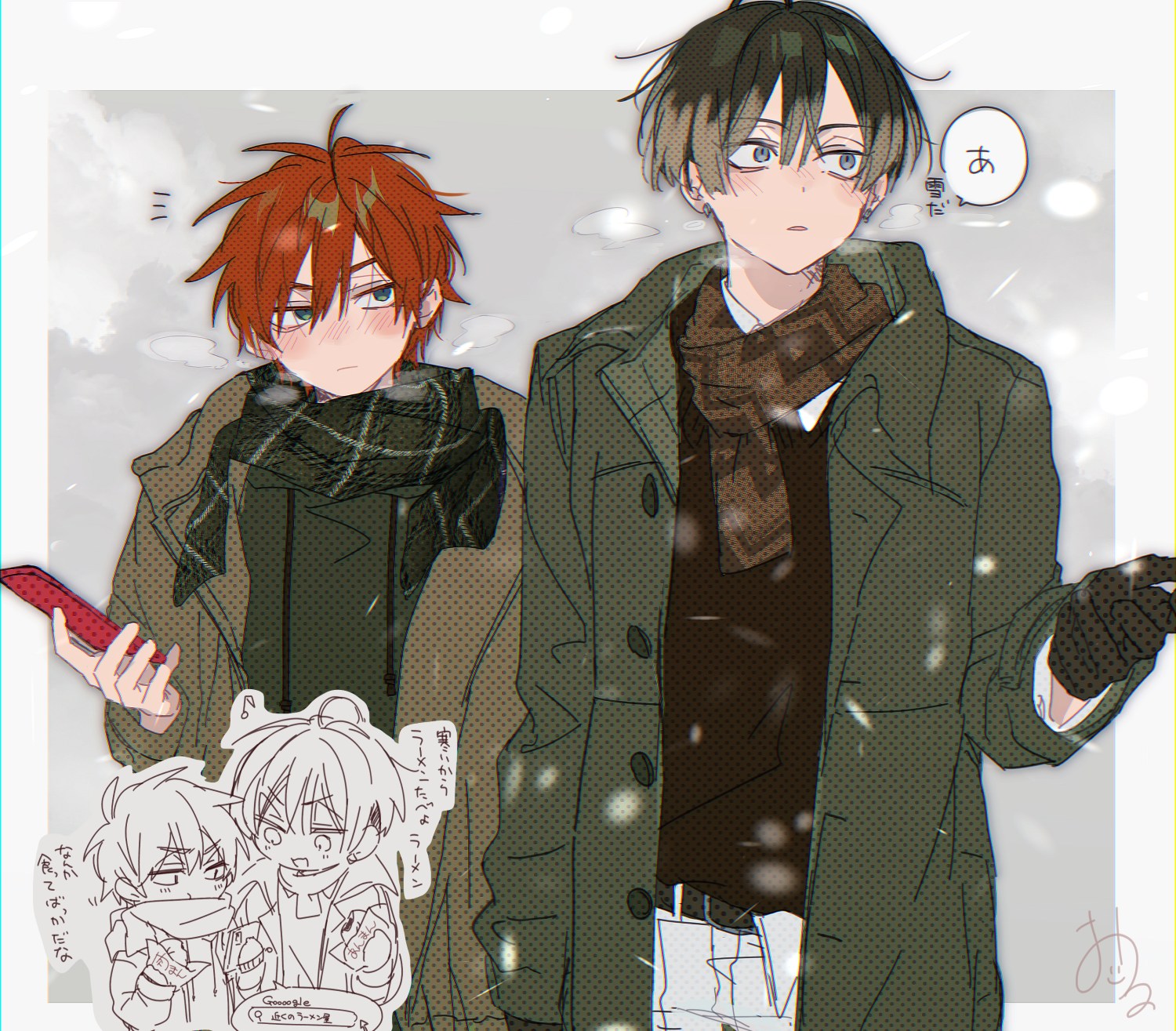 2boys belt blonde_hair blue_eyes brown_belt brown_coat brown_gloves brown_hair brown_scarf brown_shirt coat gloves grey_background highres holding holding_phone kajiyama_fuuta kao_ru05 kayano_mikoto milgram multicolored_background multicolored_hair multiple_boys pants phone plaid_clothes plaid_scarf red_hair scarf shirt short_hair speech_bubble translation_request white_pants winter_clothes