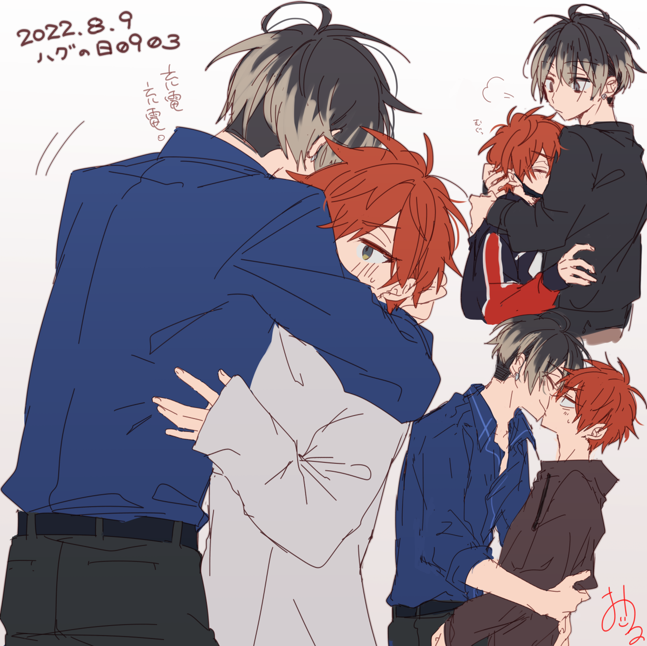 2022 2boys belt black_belt black_jacket blonde_hair blue_shirt brown_eyes brown_hair brown_hoodie brown_pants dated highres hood hood_down hoodie hug jacket kajiyama_fuuta kao_ru05 kayano_mikoto kiss long_sleeves male_focus milgram multicolored_hair multiple_boys pants red_hair shirt white_shirt yaoi