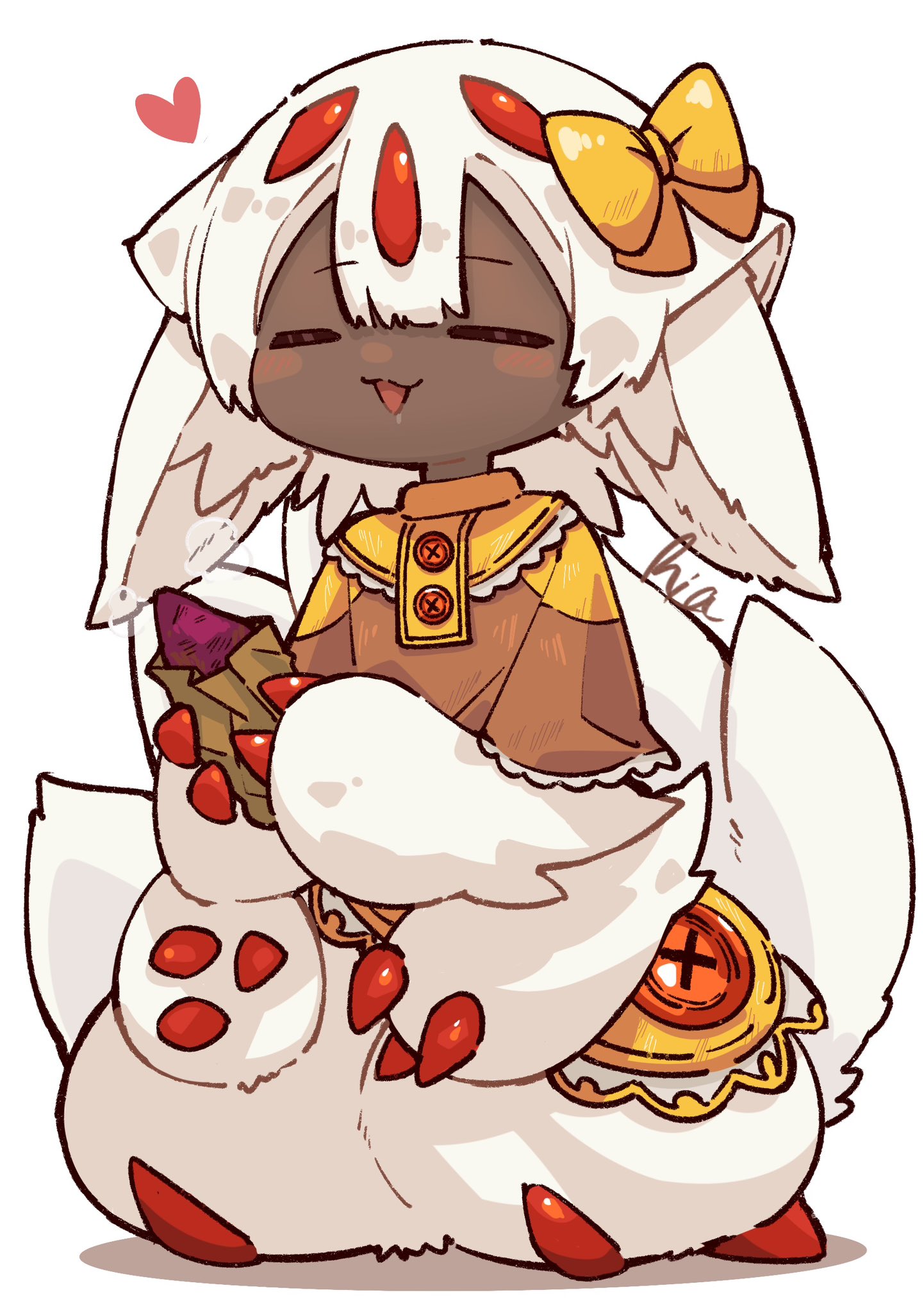 1girl :3 alternate_costume animal_ears bow brown_shirt buttons claws closed_eyes commentary_request dark-skinned_female dark_skin extra_arms faputa fewer_digits food food_wrapper full_body hair_bow hands_up heart highres holding holding_food made_in_abyss making-of_available medium_hair multiple_tails open_mouth roasted_sweet_potato shirt signature simple_background sitting skirt smile solo steam sweet_potato tail tuthigael two-tone_shirt very_dark_skin white_background white_fur white_hair white_tail yellow_bow yellow_shirt yellow_skirt